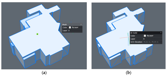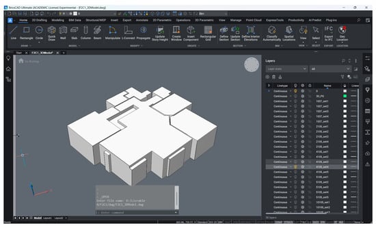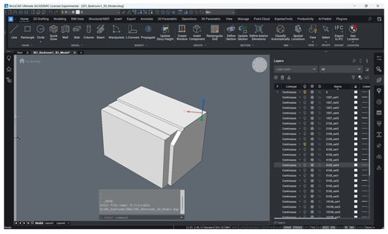 - BricsCAD is a commercial CAD platform that incorporates point cloud functionality, BIM modules, and a “Scan to BIM” workflow [74]. The BricsCAD procedure directly builds 3D solids. This workflow leverages tools for segmentation, feature extraction, and solid modeling, ultimately producing BIM-ready geometries. BricsCAD can read the mesh file (.obj), making the solidification step possible. However, as observed in our tests, the BricsCAD’s “FitRoom” function has strengths for orthogonal rooms and has limitations for non-orthogonal/stepped geometries.