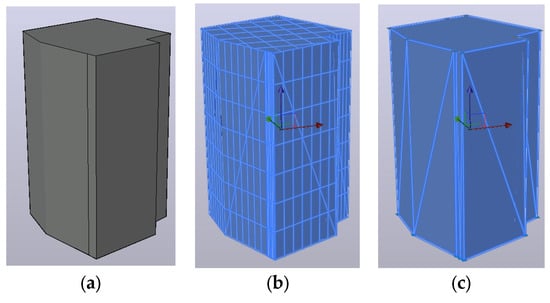 Example of mesh optimization: (a) Original mesh, (b) coplanar face merging, and (c) removal of isolated and intermediate vertices. The dots indicate the mesh vertices at each optimization stage.