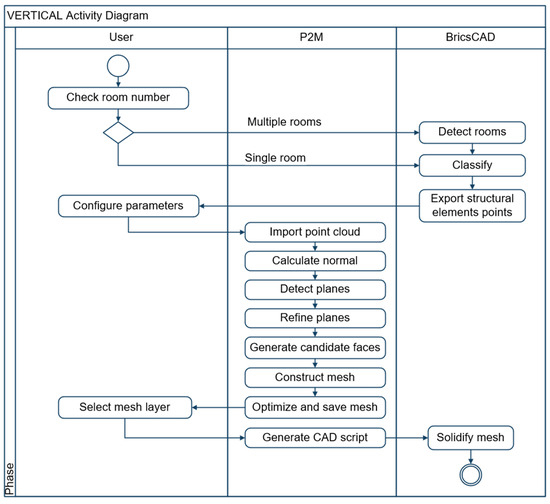 - Nature of the input and output data: The workflow clearly requires defined input and output characteristics. For input data, we only consider indoor LiDAR point clouds, ideally preprocessed to be cleaned, noise-free, and classified. Although raw data may initially be collected, the designed procedure explicitly expects cleaned data for subsequent steps. The expected output data are solid 3D models that accurately represent the geometry of vertical cadastral lots. Crucially, the models must be compatible with common CAD tools. Additionally, the workflow strictly relies on the geometric information available within the point cloud itself, explicitly excluding reliance on external semantic data, to ensure universal applicability and robustness.