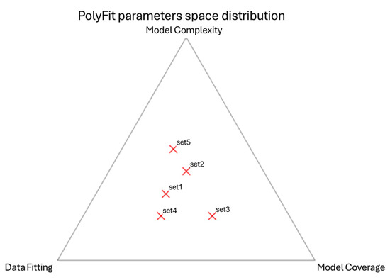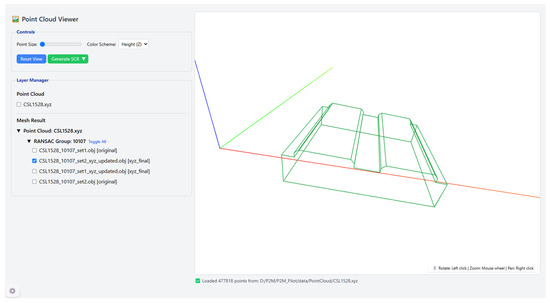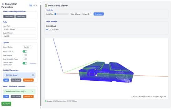 In the second stage, starting from the set of supporting planes, each refined plane is mathematically extended to form an infinite supporting plane, retaining its normal vector and positional parameters. Pairwise intersections between supporting planes are computed to obtain intersection lines. Each plane is then clipped by the intersecting planes and the object’s bounding box, while preserving the incidence relationships between faces and edges. The resulting polygons constitute the pool of candidate faces. From these candidate faces, a mixed-integer programming (MIP) solver addresses a constrained combinatorial optimization problem to select the final faces. The solver minimizes a weighted sum of energy terms: data-fitting (fitting quality of the faces), model complexity (determining simpler structures), and point coverage (ratio of the uncovered regions in the model). The hard constraints consider that each edge must be incident to exactly two faces in a closed model, or to a single face if it is a boundary edge. The optimization yields the optimal subset of faces forming a watertight, manifold polygonal surface. The outcome of this stage is a mesh file containing coordinates of each vertex, and the vertex serial consists of each face. The PolyFit parameters and corresponding definitions can be found in Table 2. In particular, the three parameters are weight normalized in [0, 1].
