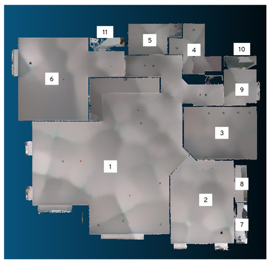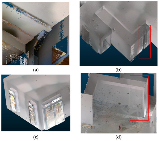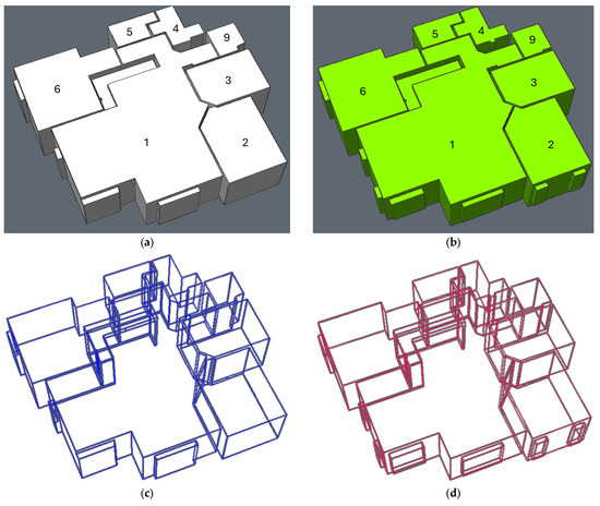 - Recognition and modeling of openings: Doors and windows represent gaps in surfaces that must be detected and integrated into the model. An algorithm might treat an open doorway as a continuous wall, thereby sealing off spaces incorrectly [48,65,66]. Missing or false openings can greatly affect the usability of the final model.