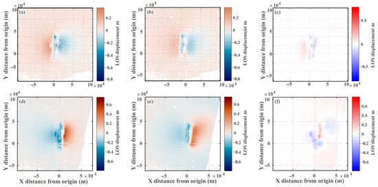 Comparison between observed and modeled deformation fields for T012A and T121D tracks: (a,d) model coseismic deformation field; (b,e) simulated deformation field; (c,f) residuals.