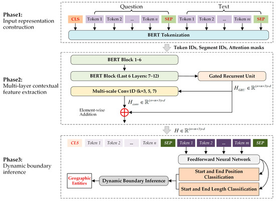 The MRC formalism treats named entity recognition as a span extraction task, where for each entity type, the model predicts the start and end positions of the answer span to a predefined question (e.g., “Which locations are mentioned in this text?”). While this formulation supports nested entities across types, it assumes that each token can belong to only one entity span per query and that start and end positions are predicted independently. Such assumptions are often violated in geographic texts, where entities frequently share prefixes, suffixes, or hierarchical relations. These limitations motivate the Geo-MRC framework, which introduces joint boundary inference and multi-layer semantic fusion to extend the standard MRC formulation for complex geographic entity structures. To this end, we propose Geo-MRC, an MRC-based framework that reformulates Geo-NER as a question-answering task to effectively handle nested and overlapping entities. As illustrated in Figure 1, the framework consists of three main components: (1) input representation construction, (2) multi-layer contextual feature extraction integrating BERT representations, GRU-based fusion, and multi-scale 1D convolutions, and (3) dynamic boundary inference that jointly predicts start positions, end positions, and span lengths to reconstruct complete entity spans.