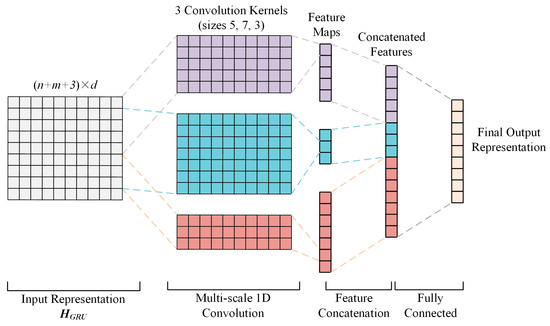 To better recognize entities of varying lengths, we apply multi-scale 1D convolutional operations. These convolutions capture local contextual features across different receptive fields, thereby strengthening the model’s ability to detect geographic entity boundaries. As shown in Figure 3, convolutional kernels with different widths are applied to the GRU-fused representations to extract features over multiple contextual spans.