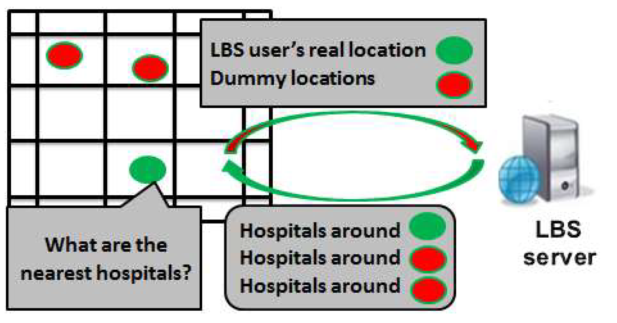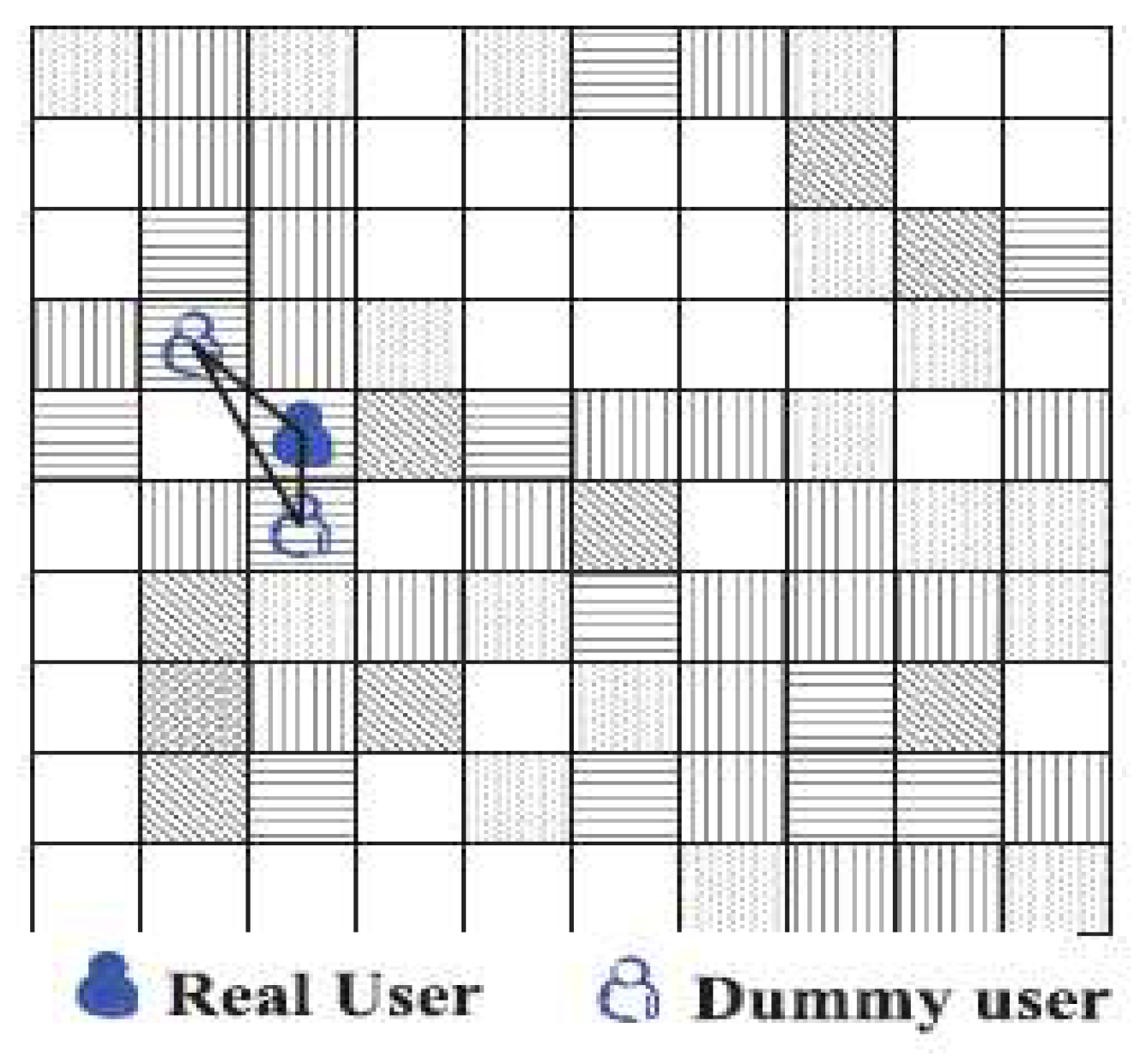 - Hidetoshi, K.; Yanagisawa, Y.; Satoh, T. An anonymous communication technique using dummies for location-based services. In Proceedings of the ICPS’05 International Conference on Pervasive Services, Santorini, Greece, 11–14 July 2005. [Google Scholar]