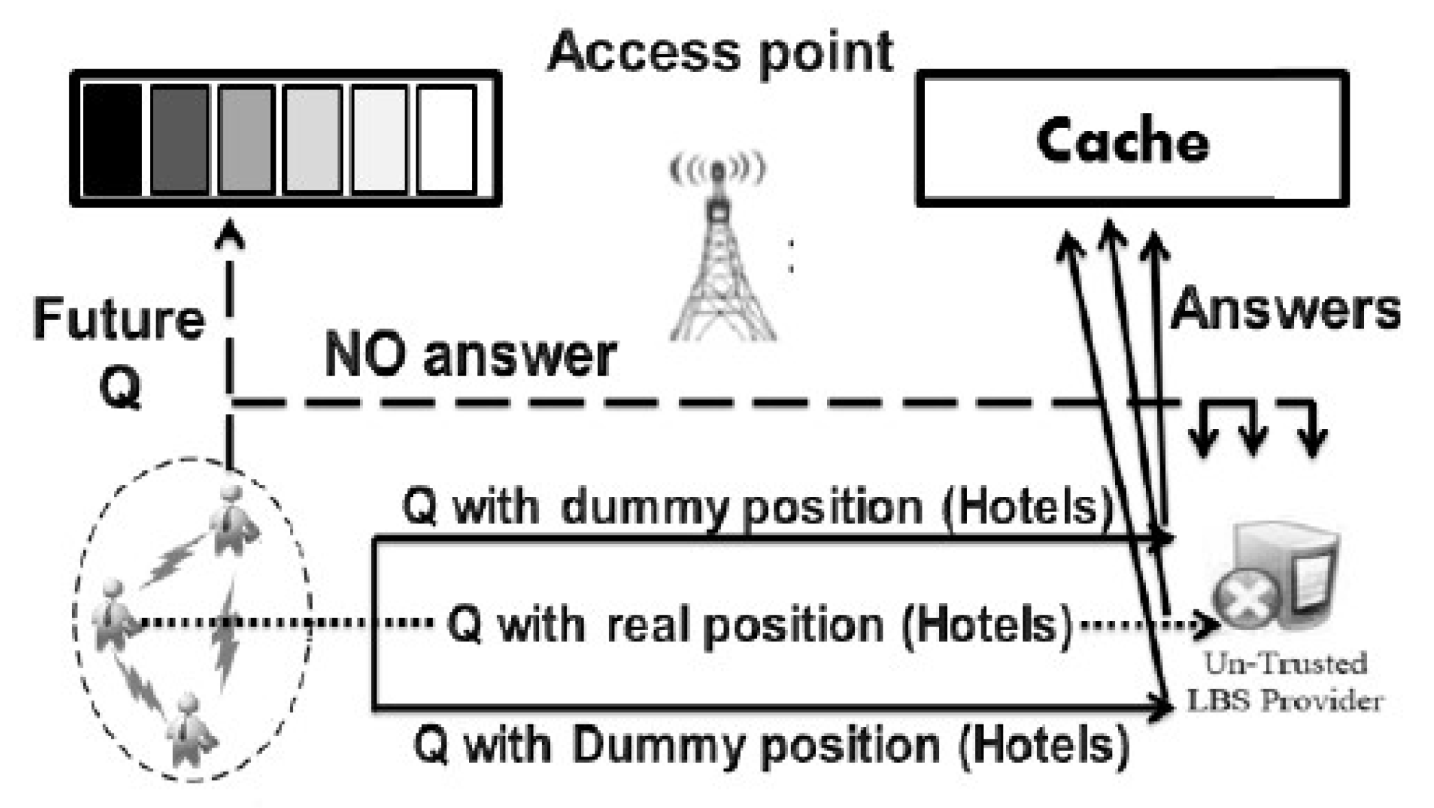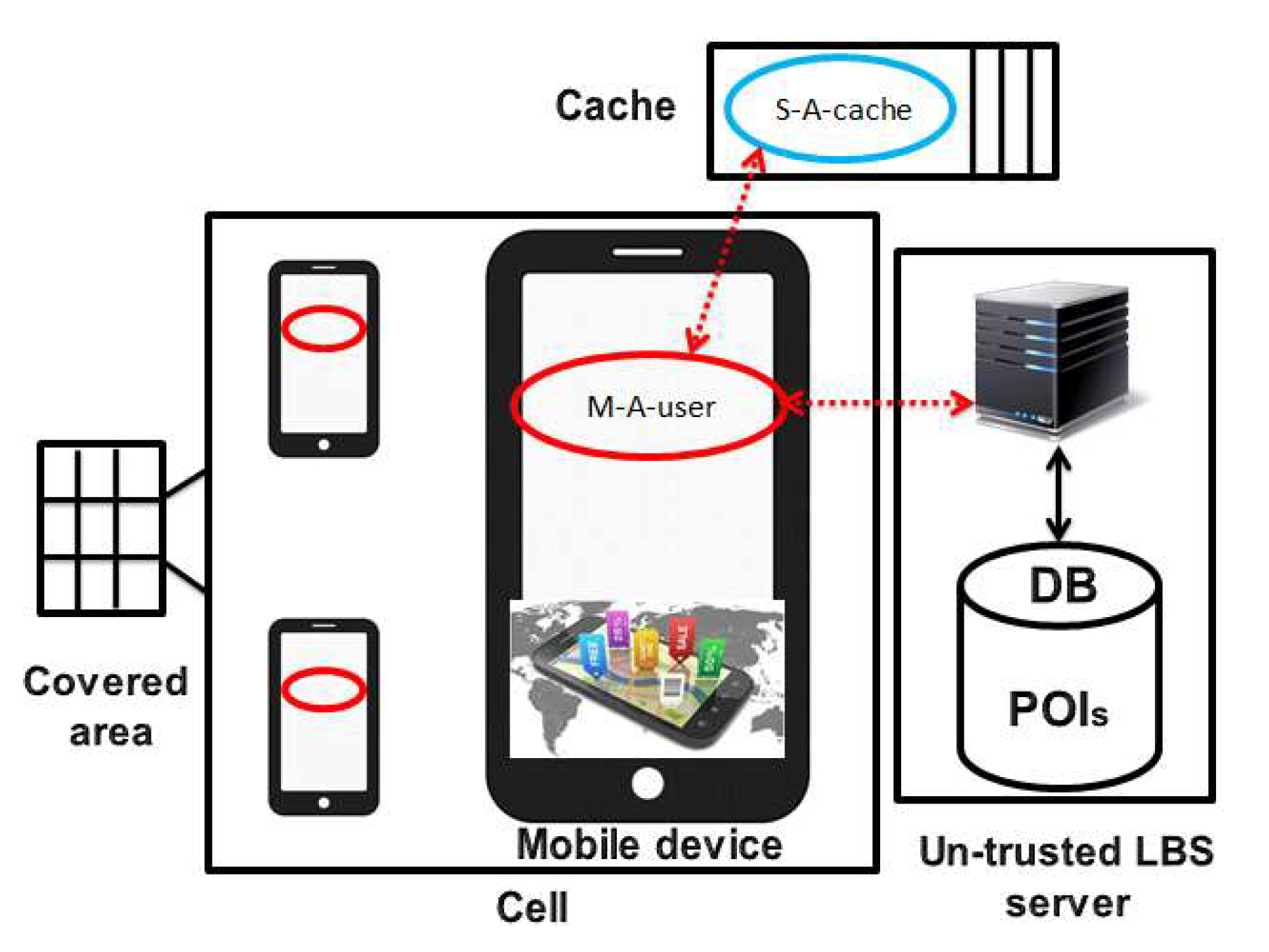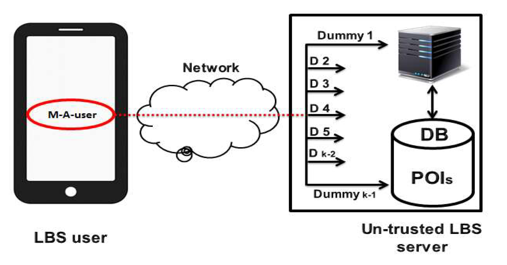| Description | The coordinates of the exact location of the LBS user. | The queried interest. | The queried range. | The identity of the LBS user. |