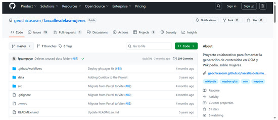 Figure 1. Open repository of the project Las Calles de las Mujeres, hosted on GitHub, where code, scripts, sample datasets, and methodological guidelines are publicly available. This space documents each phase of the workflow and ensures the openness, replicability, and transparency of the methodology, enabling other collectives and institutions to reproduce and adapt the project in different cities (https://github.com/geochicasosm/lascallesdelasmujeres, accessed on 31 October 2025).
