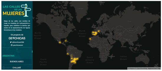Within this framework, the collective Geochicas OSM was founded in 2016 within the OSM community in Latin America, with the aim of reducing the gender gap in digital cartography and empowering women through open data [26]. Since then, this collective has launched emblematic projects such as Las Calles de las Mujeres (“Women’s Streets”) [27], which exposes the limited representation of women in city toponymy, and Yo te nombro (“I Name You”), a collaborative map of feminicides in Mexico [28]. These projects reveal both the transformative power of collaborative mapping and the urgency of contesting the hegemony of corporate platforms such as Google Maps, whose commercial logic contrasts with the open and community-driven ethos of OSM [29,30].