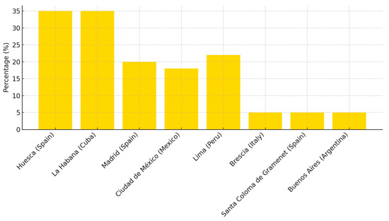 Moreover, the results reveal that differences among cities are not limited to the absolute number of mapped streets but also extend to the proportion of streets named after women (Figure 3). Cases such as Huesca (Spain) or Havana (Cuba) stand out with percentages above 35%, positioning themselves as benchmarks for the visibility of women in toponymy. At the opposite extreme, cities such as Brescia (Italy), Santa Coloma de Gramanet (Spain), or Buenos Aires (Argentina) barely reach 5%, highlighting the persistence of a significant gender gap in the symbolic construction of urban space.