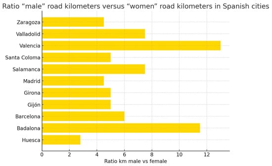 Figure 4. Ratio of “male” road kilometers versus “women” road kilometers in Spanish cities. Source: project database (2024).
