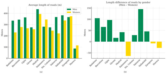 Figure 5. Average street length and length differences by gender in Spanish cities. (a) Average length of roads named after men and women (in meters); (b) Difference in average length between male- and female-named roads (Men–Women).