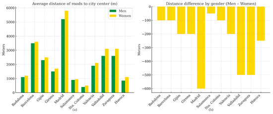 Figure 6. Distance of roads by gender. (a) Average distance of male- and female-named roads to the city center; (b) Difference in average distance by gender (Men–Women).
