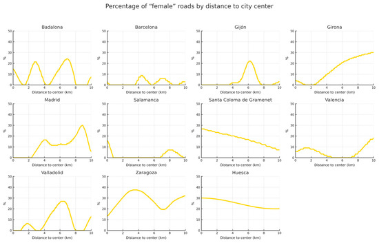 The city-by-city comparisons (Figure 7) reveal that the share of female streets often increases toward the periphery, consistent with naming practices in newer urban developments. However, this pattern is not uniform: in some municipalities, such as Santa Coloma de Gramanet and Valencia, the opposite trend is observed, indicating a strong dependence on local policies and the historical trajectories of urban growth.
