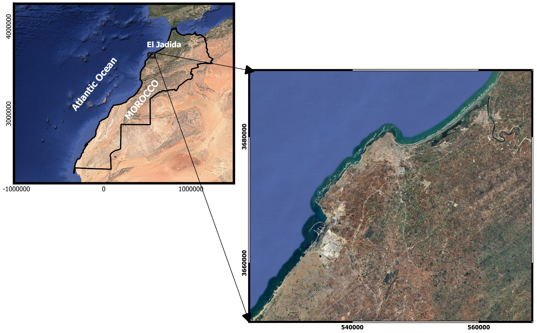 - El Mjiri, I.; Rahimi, A.; Bouasria, A. Remote sensing and GIS at the heart of the smart management of El Jadida City (Morocco). In Proceedings of the 4th Smart Cities Symposium (SCS 2021), Virtual, 21–23 November 2021. [Google Scholar]