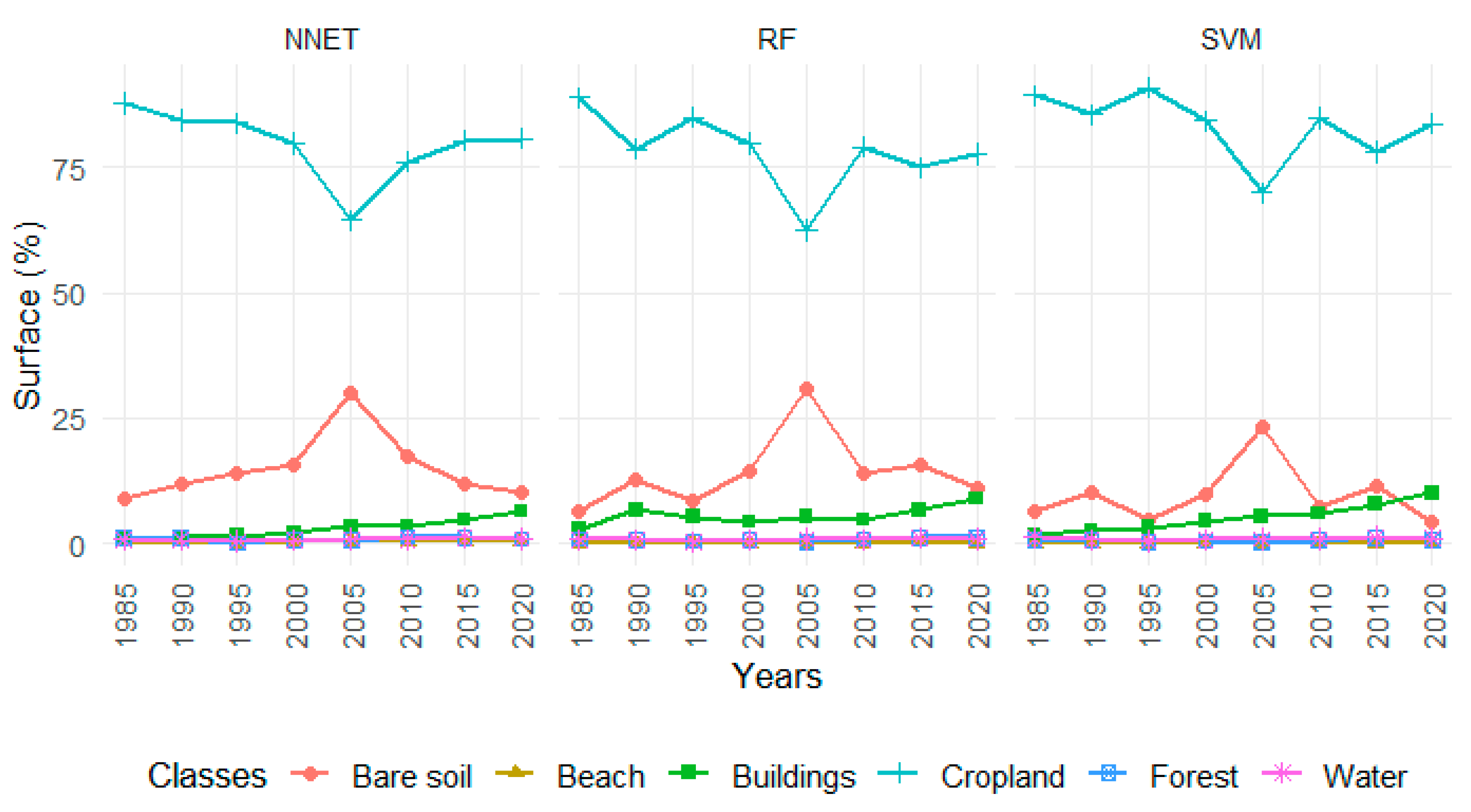 - Xie, G.; Niculescu, S. Mapping and monitoring of land cover/land use (LCLU) changes in the crozon peninsula (Brittany, France) from 2007 to 2018 by machine learning algorithms (support vector machine, random forest, and convolutional neural network) and by post-classification comparison (PCC). Remote Sens. 2021, 13, 3899. [Google Scholar]