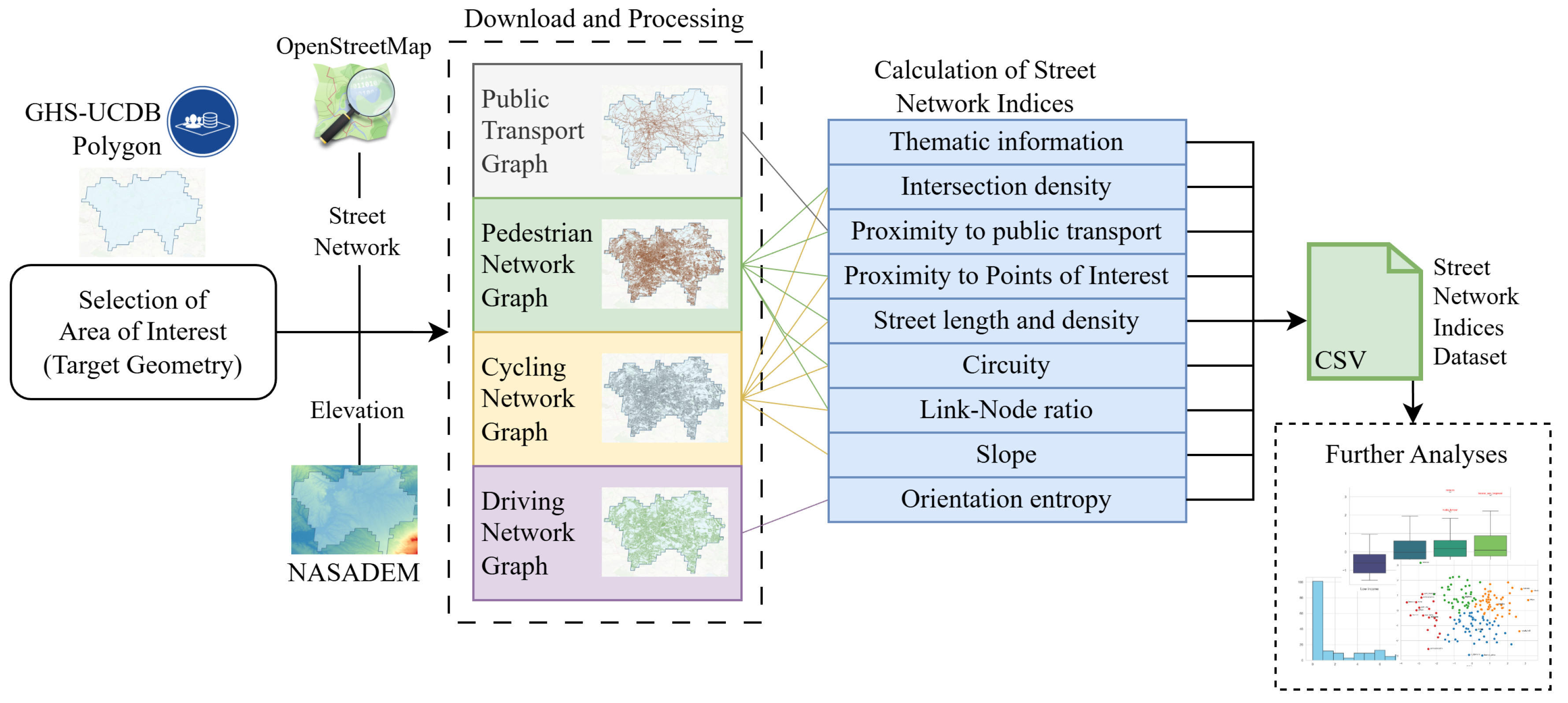 Our methodology proposes the usage of mode-specific street networks extracted from OpenStreetMap (OSM) and augmented by elevation data from the NASADEM dataset to calculate mode-specific street network indices related to proximity to POIs, proximity to public transport, circuity, street length, link–node ratio, slope, intersections, and orientation entropy. This approach addresses a prevalent gap in previous studies that often overlook the distinct characteristics of mode-specific street networks, specially for pedestrians and cyclists. We presented a comprehensive description of the methodology, describing the steps for downloading and preprocessing each street network type, as well as providing an overview of the indices that were selected from the academic literature and details about their implementation.