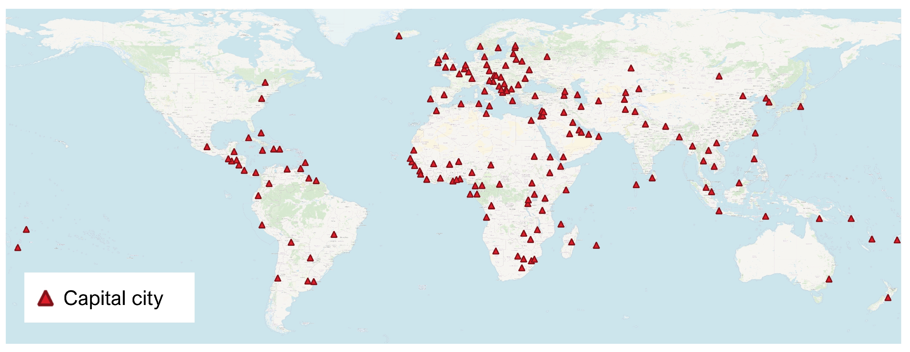 Despite the total of sovereign states being more than 176, after an initial evaluation of the data availability, some cities were excluded from the analysis. For some countries, the capital city was replaced with another representative city of the country, based on its data availability. The countries of Andorra, Antigua and Barbuda, Bhutan, Cabo Verde, Dominica, Federated States of Micronesia, Grenada, Kiribati, Liechtenstein, Marshall Islands, Monaco, Palau, Saint Kitts and Nevis, Saint Lucia, Saint Vincent and the Grenadines, San Marino, Seychelles, and Tuvalu were excluded due to a lack of GHS-UCDB polygon on their respective capital cities or any important city in the country. The countries of Kosovo, Palestine, Taiwan, and Vatican City were excluded as they are not current members of the United Nations (as of July 2025). The country of Nauru was also excluded as it does not have an official capital city, and the country of Cyprus was excluded as its capital city is currently disputed.