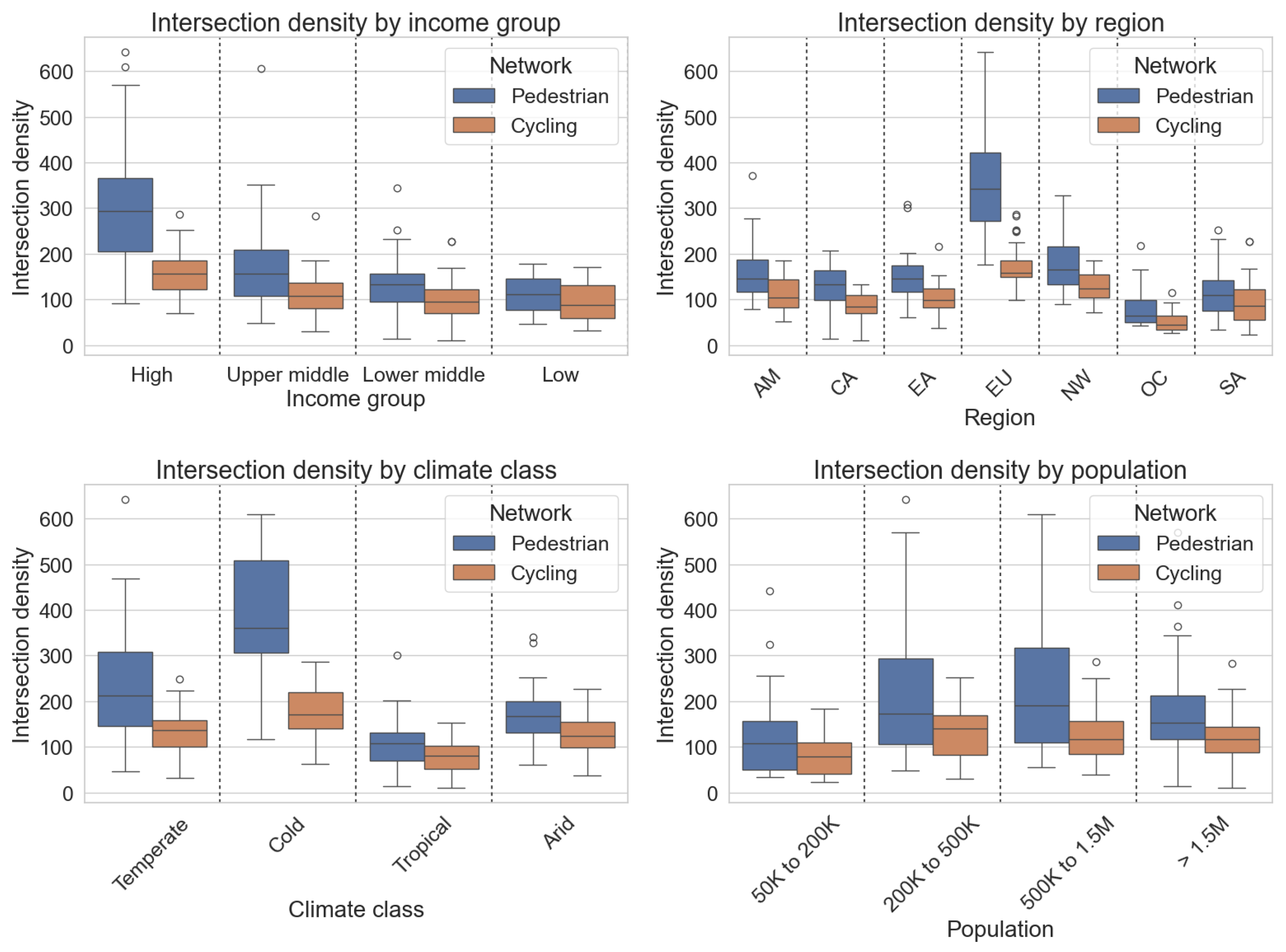 Figure 4 shows side-by-side the box plots of the intersection densities for pedestrian and cycling street networks, grouped by income group, geographical area, climate group, and population. Intersection density has been found to be an indicator of function, connectivity, and compactness of urban areas, as stated in