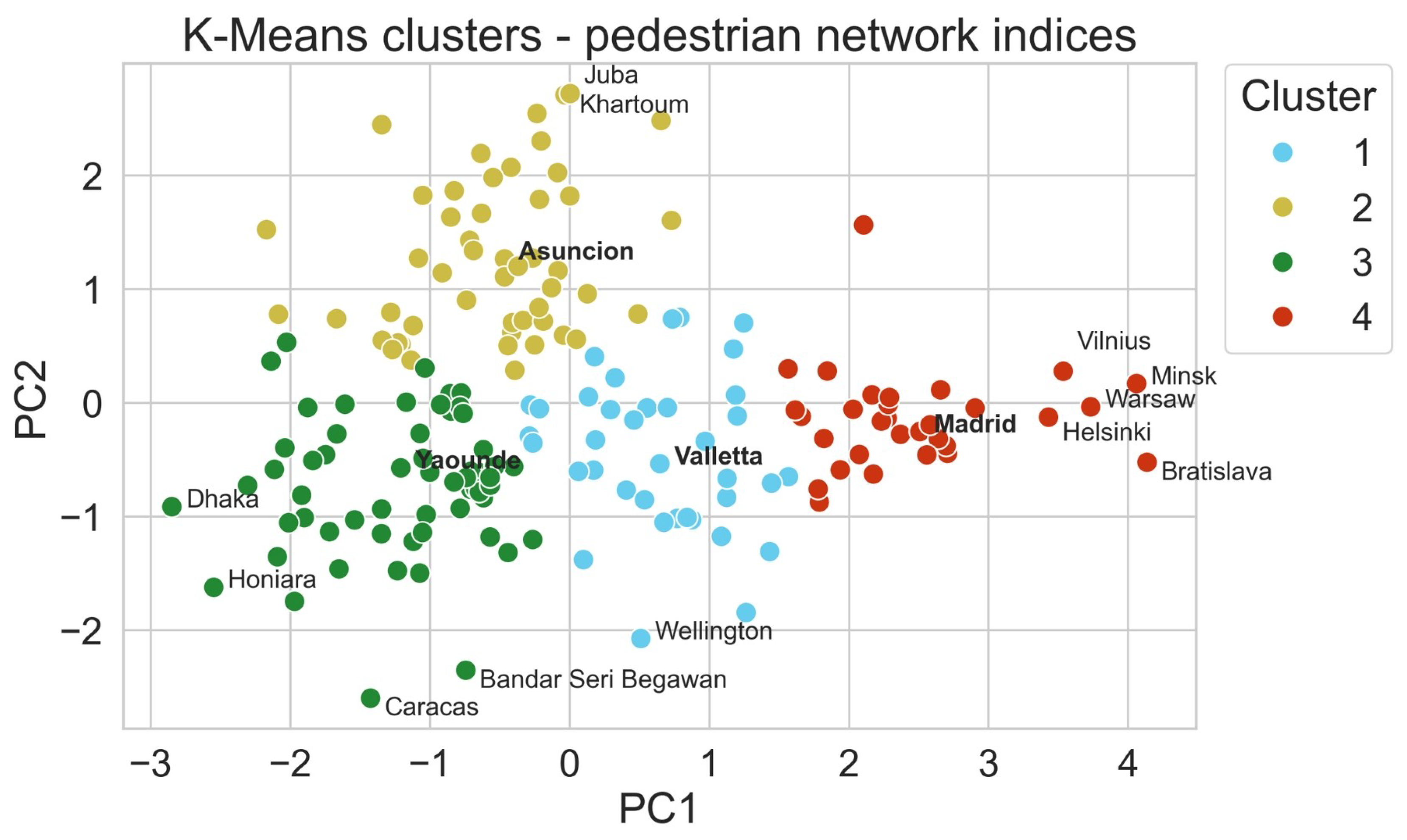 In general, higher PC1 and PC2 values indicate more walkable networks. For PC1, high intersection and street densities are indicators of connectivity, compactness, and good design, higher proximities to POIs and public transport are more desirable to pedestrians, and shorter street segments are regarded as more walkable. Consequently, higher PC2 values are achieved by lower values of circuity, which is an indicator of street network efficiency, and higher link–node ratios, which indicate increased connectivity and compactness. Both components capture 80% of the dataset variance. For each city, the value of PC1 and PC2 was calculated, and a K-Means clustering with four clusters was performed. The number of clusters was selected using an elbow test. The results of the clustering for the pedestrian networks are shown in