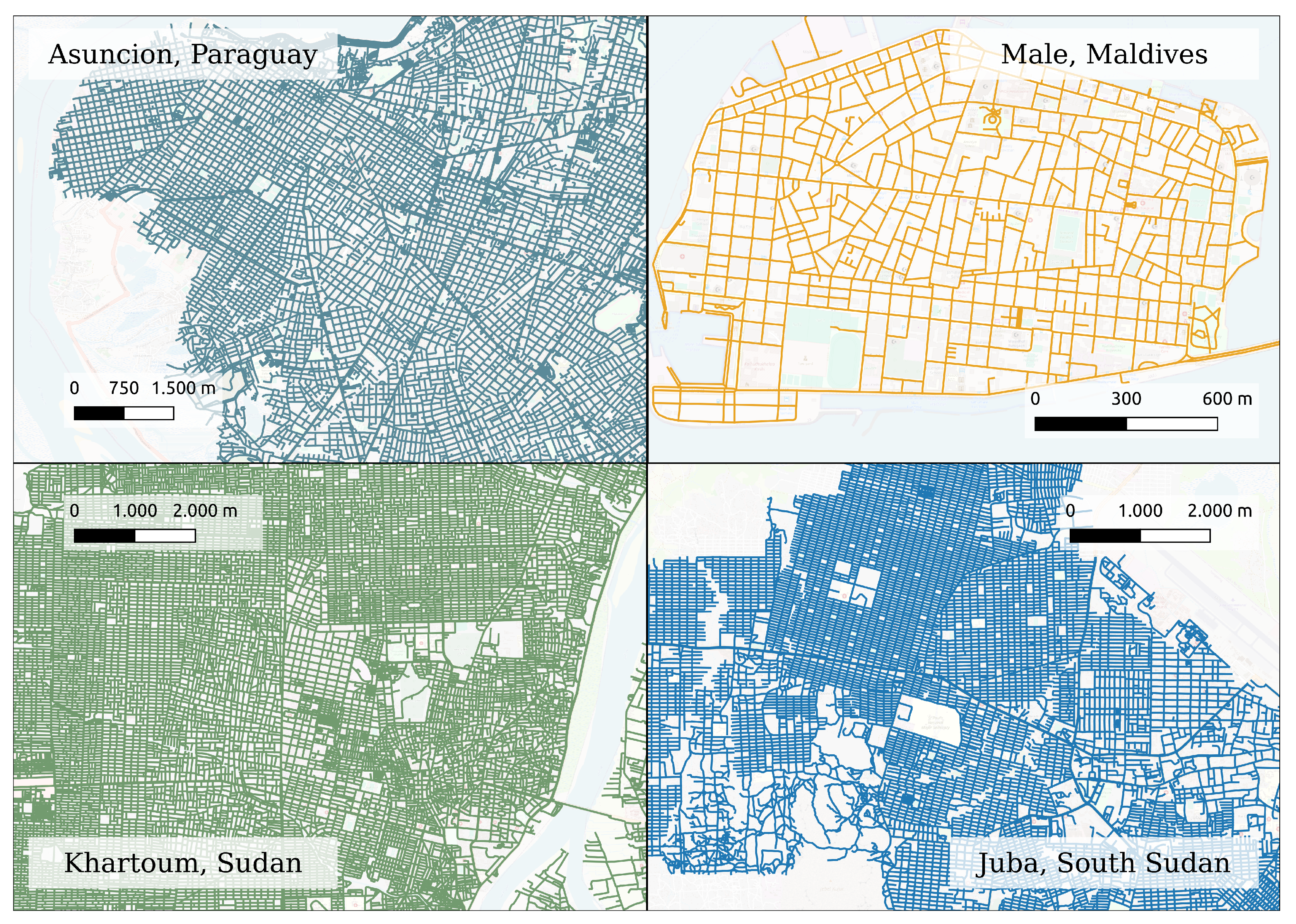 Figure 6: Asunción (Paraguay); Male (Maldives); Khartoum (Sudan); and Juba (South Sudan). The experimental results from a study by Nathan et al. [