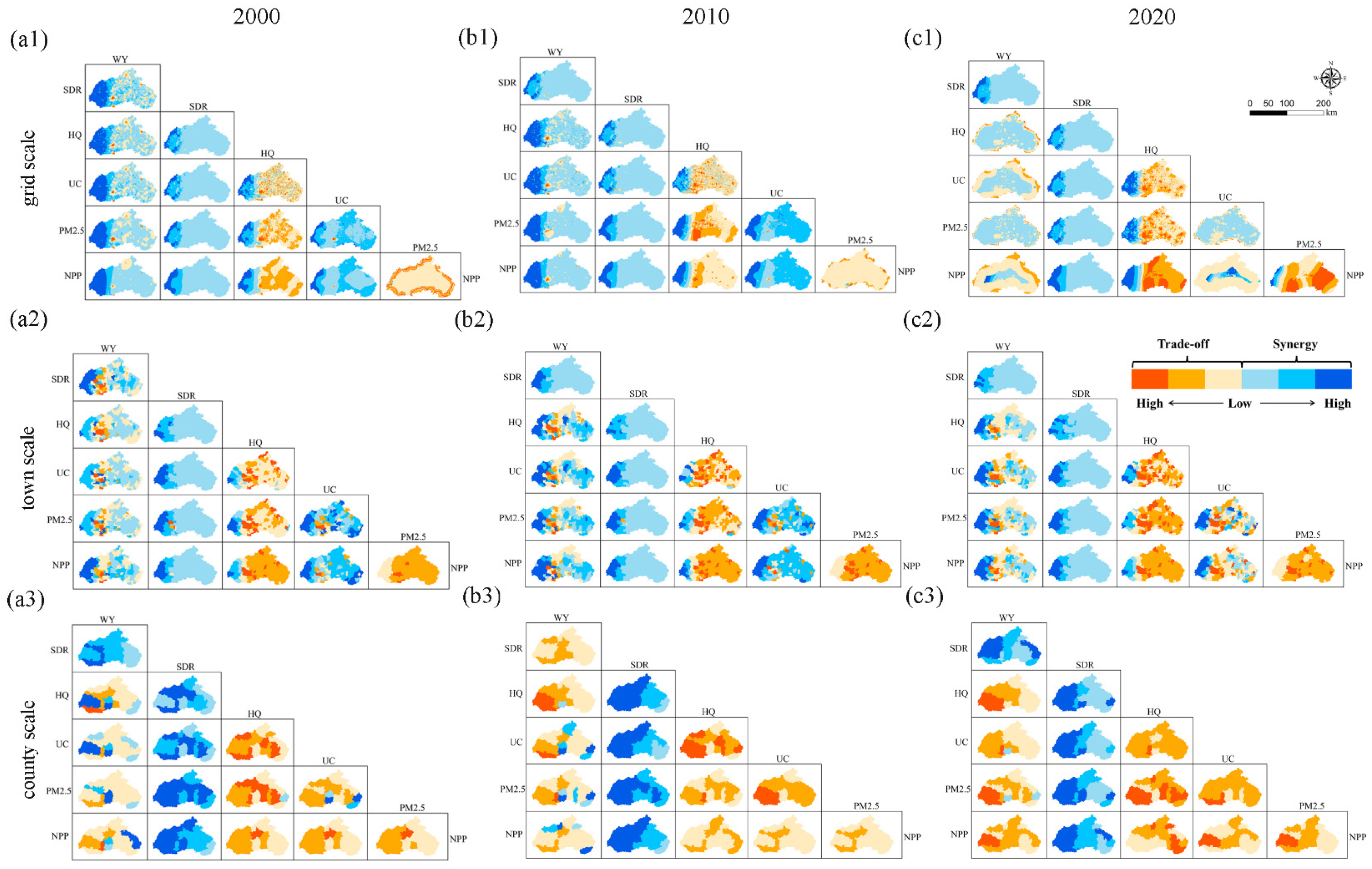 - Liu, Q.; Qiao, J.; Li, M.; Huang, M. Spatiotemporal Heterogeneity of Ecosystem Service Interactions and Their Drivers at Different Spatial Scales in the Yellow River Basin. Sci. Total Environ. 2024, 908, 168486. [Google Scholar] [CrossRef]
