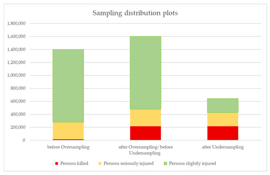 We used a self-developed sampling approach to train an ML model that can classify crash severity based on features. We subsequently used the test dataset to evaluate the model’s quality and visualize the semi-global influencing factors. To train a meaningful ML model, a large amount of uniformly distributed, heterogeneous crash data is required. We compile the training data independently of specific geographical regions to avoid distortions and maximize the model’s performance with training data as variable as possible. However, the distributions of individual crash severities in the enriched dataset are still imbalanced. Previous work additionally highlights this issue [15]. They compared trained ML models with balanced and unbalanced data sets. They found that correlations between input features and target variables were only present in balanced datasets. Finding the right class in an imbalanced dataset was difficult, and classification quality based on error measures was over 10% worse (NN, decision trees, SVM, and Naive Bayes were examined). The use of undersampling or oversampling is essential. One disadvantage of undersampling is that the ML model cannot see and adapt important information contained in randomly deleted instances. Researchers frequently apply oversampling for this reason. In particular, the Synthetic Minority Over-sampling TEchnique (SMOTE) is widely used. Rather than simply copying instances of the underrepresented class until the class distribution is equal, SMOTE creates synthetic instances. Copying the data would lead to overfitting because the same instances would always form the basis of the data. SMOTE creates new instances by generating feature values based on neighboring instances, resulting in unique values. Overfitting can also occur when there are extensive new generations and little initial data. SMOTE adjusts inherently imbalanced crash data, as demonstrated in previous studies [5,14]. The new sampling approach also uses this proven sampling method.
