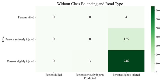 Adding another feature, the road class, makes the data set more complex. This requires a model that can correctly map the increased complexity. Only the XGBoost algorithm increased the quality of the classification results (see Figure 5). The MLP-NN performed worse in all error measures. It misclassified crashes with minor injuries as crashes with serious or fatal injuries. This is evident in the class’s recall value of 34%. Additionally, the model identified fewer actual crashes with fatal severity. After enriching the data with the road class, the model incorrectly predicted more crashes than serious crashes.
