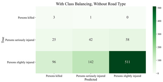 The confusion matrix presents the classification results of XGBoost using the German data as training input after adjusting the class distribution in the training data. (Without road class).