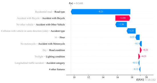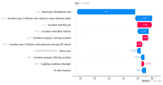 Waterfall plot with of the decision making of a crash with ‘Persons killed’. This is after the processing step of adding up the categorical features. In the SHAP plots, negative contributions are shown in blue, while positive contributions are shown in red.