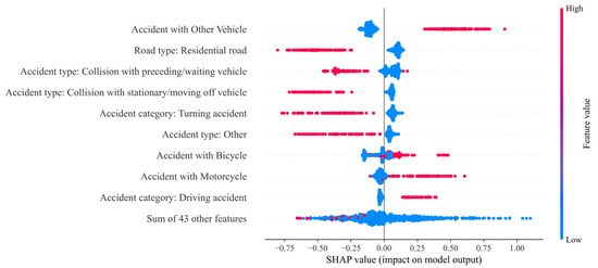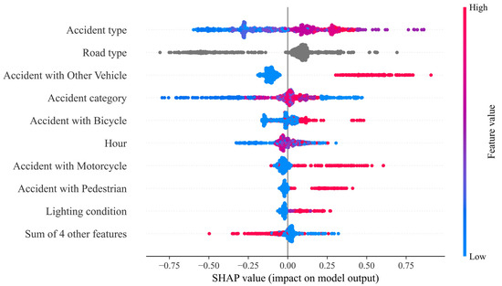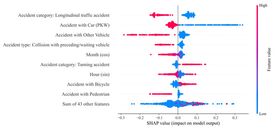 The SHAP values of the categorical features required post-processing because pre-processing with one-hot encoding split them into several binary variables (e.g., crash type and Lighting condition). One original feature consists of several feature classes (see Figure 9). This makes explanations more difficult because there are now several influencing factors for each original feature.