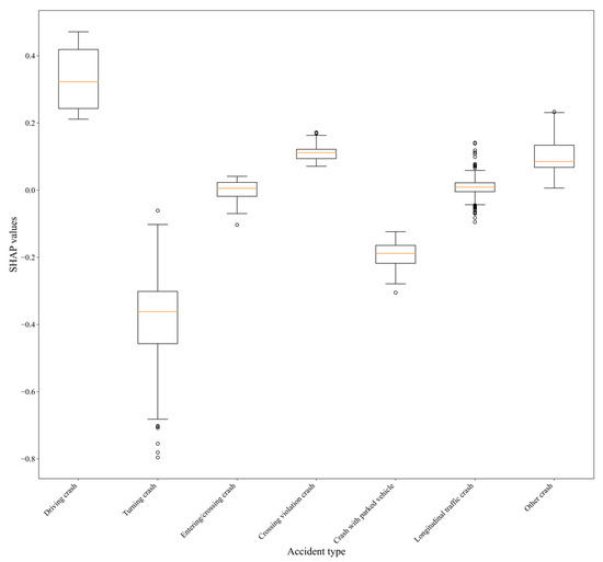 We used a boxplot to visualize how feature classes influence a specific crash class (See Figure 15). For example, we use the boxplot to show the individual crash type categories and their average influence on the probability of a crash being classified as fatal. This representation allows one to compare the influencing factors of the classes of an individual feature. However, it is important to note that all instances are considered—including those, the model does not predict as fatal crashes. We based our approach on handling and visualizing categorical features on the work of [23].