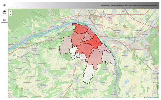We developed this concept to address the research questions posed in Section 1. The goal is to present a solution for calculating semi-global influencing factors and, subsequently, communicate them in an accessible manner. There is a research gap in communicating spatial influencing factors. We designed the prototypical dashboard implementation to present a possible solution to this issue. In the use case, we dynamically summarize crash data, ML results, and influencing factors to enable in-depth analysis. This allows specialist users, such as road planners, crash researchers, ML experts, and road users, to explore the large number of individual ML predictions or evaluate the quality of the ML model. Geo-referencing crashes makes it possible to show spatial patterns. We developed this prototype for German analysts, so the upcoming screenshots show only the German version.