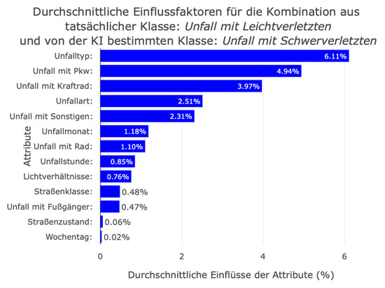 This bar plot shows the influencing factors in the district ‘Neustadt’ that led the model to misclassify minor injury crashes as serious injury crashes.