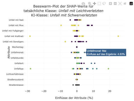 A beeswarm plot visualizes the individual influencing factors in the district ‘Neustadt’, taking into account both the actual and predicted classes. The x-axis shows the predicted probability expressed in percent. The y-axis shows the attributes that have a positive or negative influence on the overall probability of the prediction. For binary attributes (e.g., whether a vehicle was involved), purple indicates “No” and yellow indicates “Yes”. The exact values for each point can be viewed by hovering over the points.