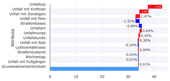 Waterfall plot in the web dashboard to visualize the local factors influencing the forecast: Persons seriously injured. The x-axis shows the predicted probability expressed in percent. The y-axis shows the attributes that have a positive or negative influence on the overall probability of the prediction. Like SHAP plots, negative contributions are shown in blue, while positive contributions are shown in red.