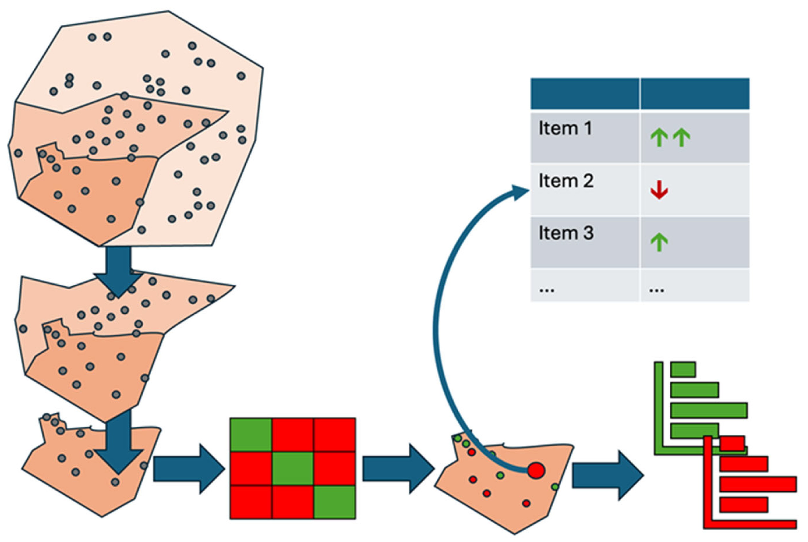The first step is spatial segmentation. With geographic data in particular, it is essential to recognize and analyze spatial patterns and relationships. The challenge lies in structuring the data in a meaningful way to make semi-global statements, especially when data points distribute irregularly in space. Therefore, the data set is first divided into clearly definable geographical areas. These areas can be administrative boundaries, such as federal states, counties, or city districts. Alternatively, sub-areas based on social, infrastructural, or climatic criteria, such as forest, urban, and rural areas, are also possible. The choice of segmentation depends on the available data and the respective use case.
