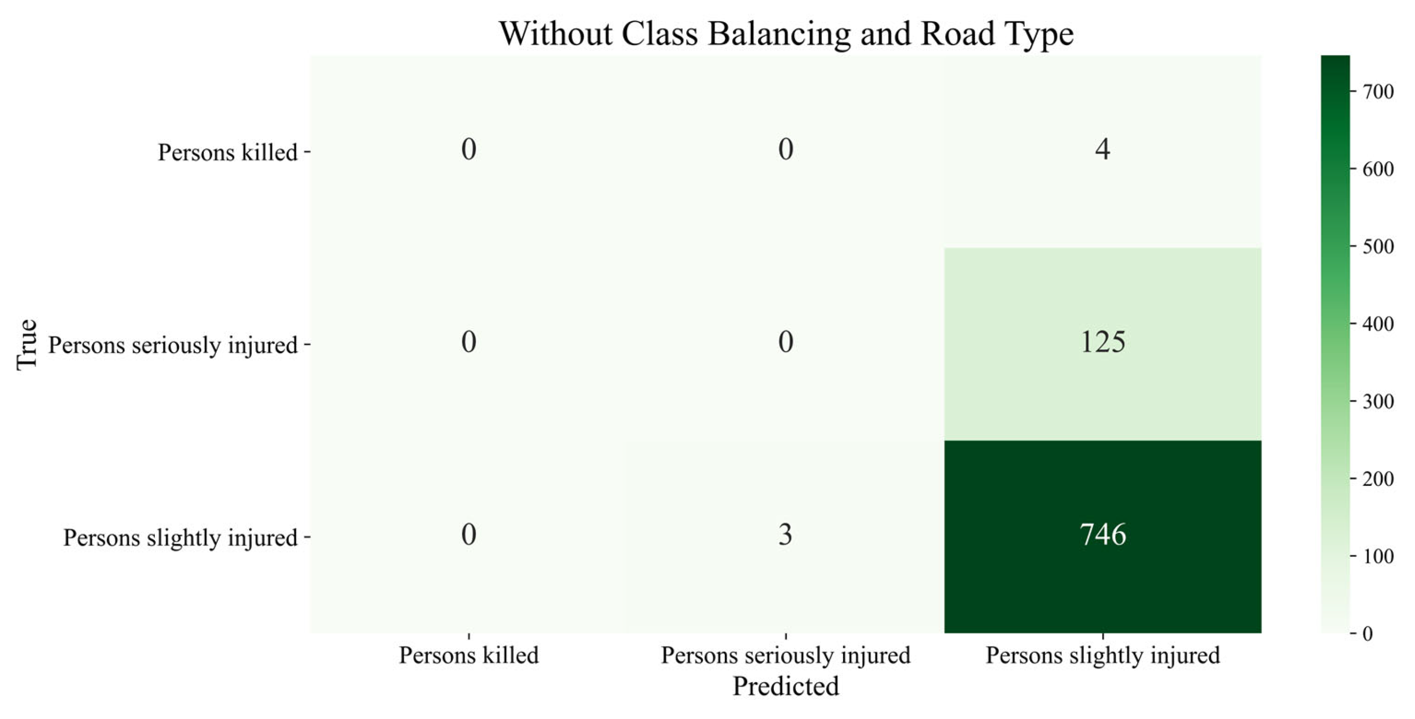 Figure 5). The MLP-NN performed worse in all error measures. It misclassified crashes with minor injuries as crashes with serious or fatal injuries. This is evident in the class’s recall value of 34%. Additionally, the model identified fewer actual crashes with fatal severity. After enriching the data with the road class, the model incorrectly predicted more crashes than serious crashes.