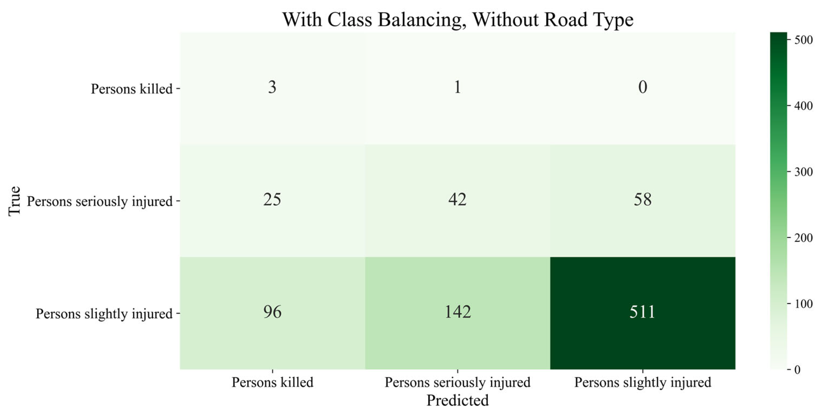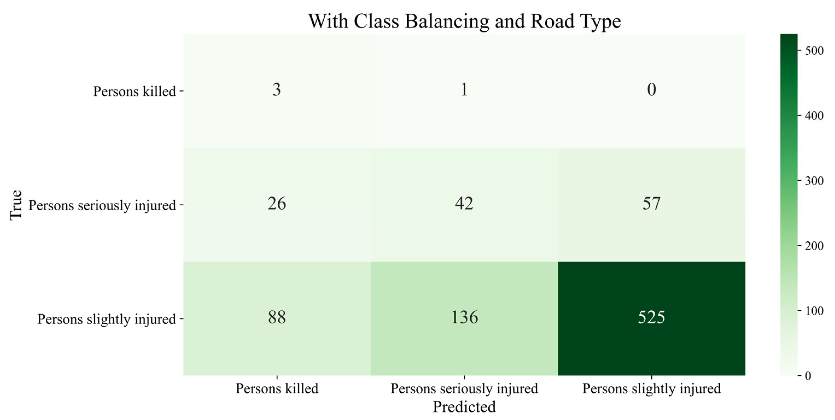 Figure 3). Then, we repeated the training with the adjusted crash severity classes. For the third model training, we used the balanced crash data and considered the road class for the two ML approaches. However, this data augmentation only improved the XGBoost model.