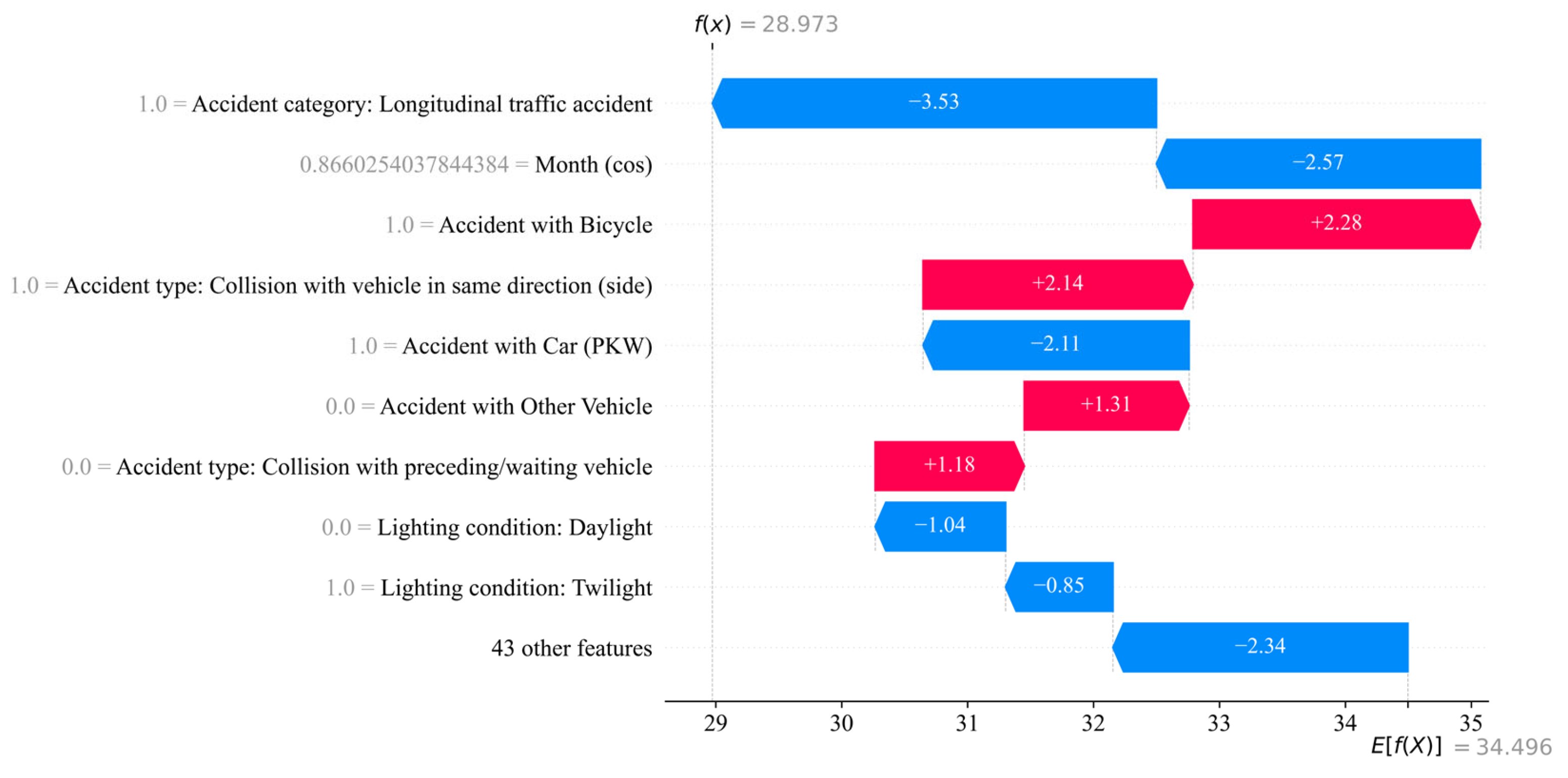 The factors influencing an ML prediction are visualized using waterfall plots of the three crash severities (e.g., ‘Persons slightly injured’). In the SHAP plots, negative contributions are shown in blue, while positive contributions are shown in red.