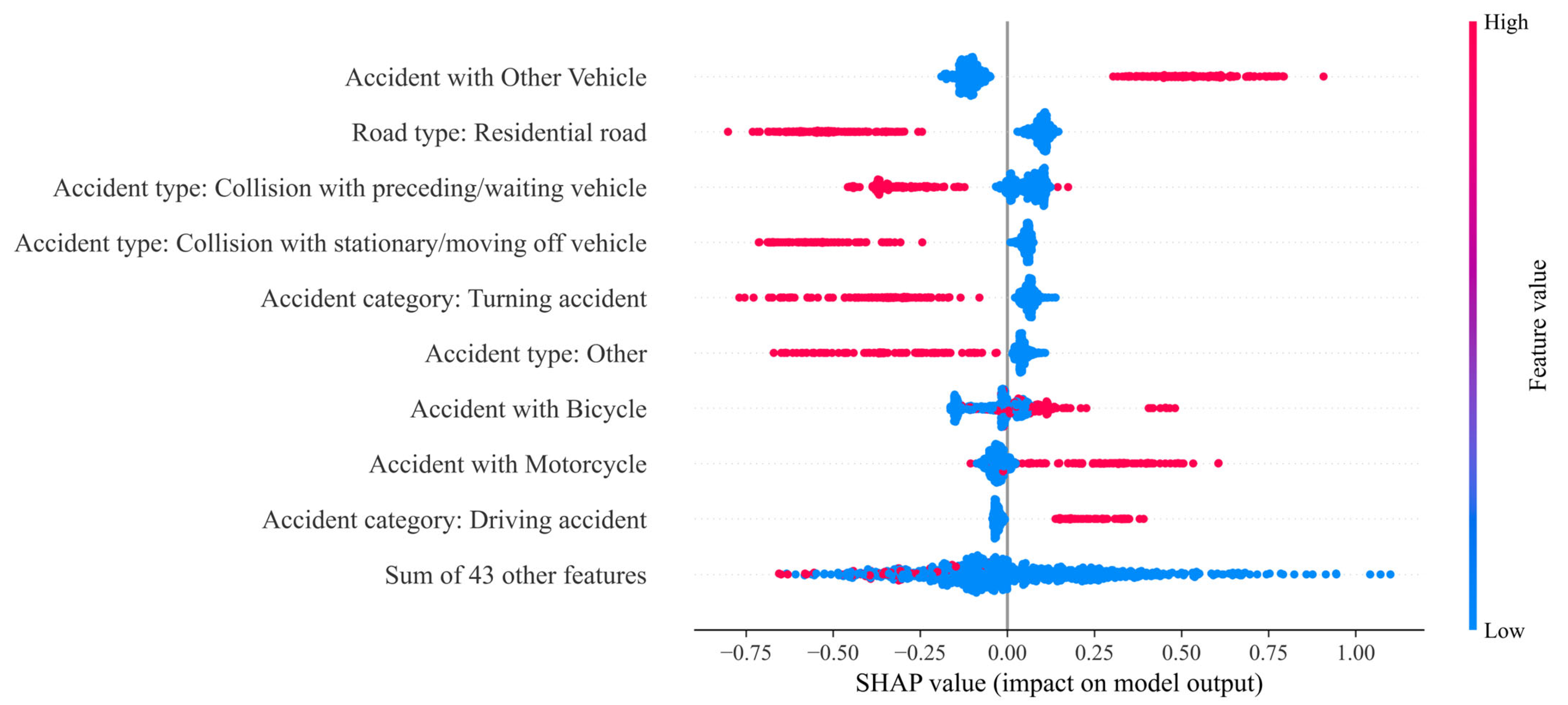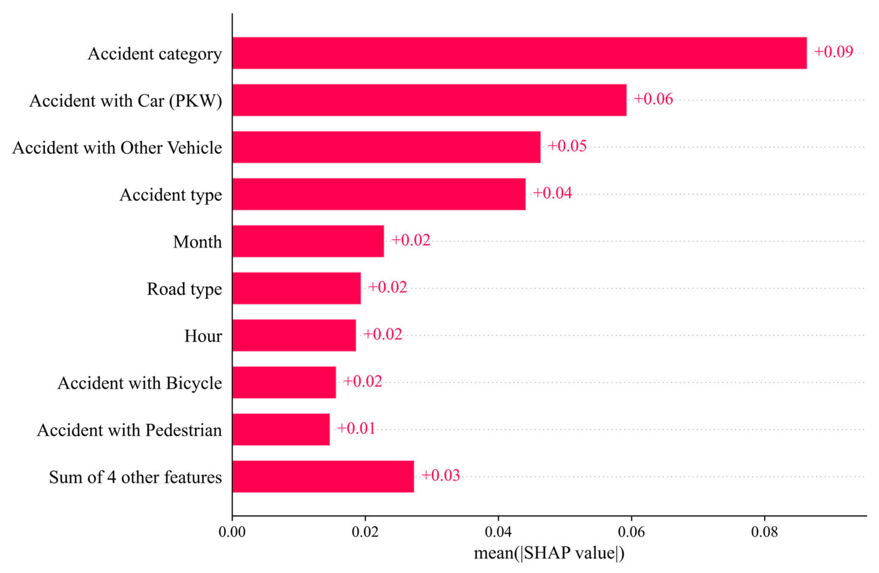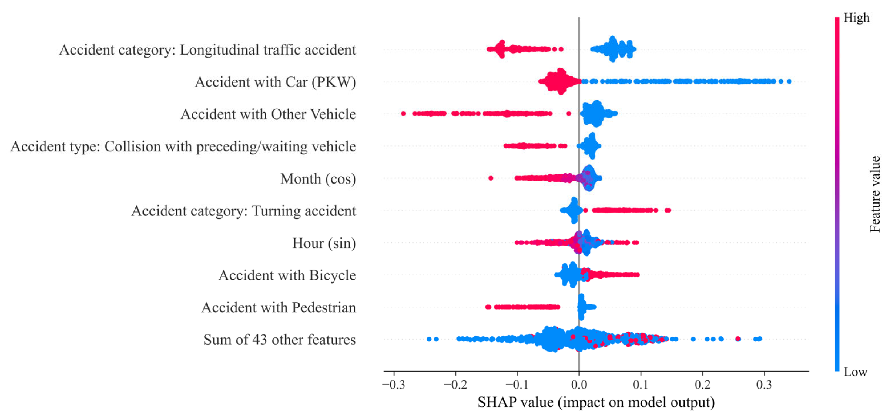 Section 2, relevant characteristics must describe crashes. During publication, information such as the exact date and details about the individuals involved (e.g., age, gender, and driving experience) or possible drug or alcohol influences was removed. The state and federal statistical offices even generalized or summarized other details, such as weather conditions, the number of people involved, speeds, and road data. The absence of these proven relevant influencing factors can lead to a simpler, and therefore less meaningful, model. We were not able to consider important crash characteristics when training the ML model. This has caused incorrect correlations between the crash data or created information gaps in the crash description. These issues become apparent when analyzing the model using SHAP. For example, misclassified crashes in which the severity of the crash was incorrectly stated as fatal instead of minor disproportionately influenced the feature ‘Crash with Other Vehicle’ (e.g., truck, bus, or streetcar) since motor vehicles were predominantly involved in fatal crashes (see