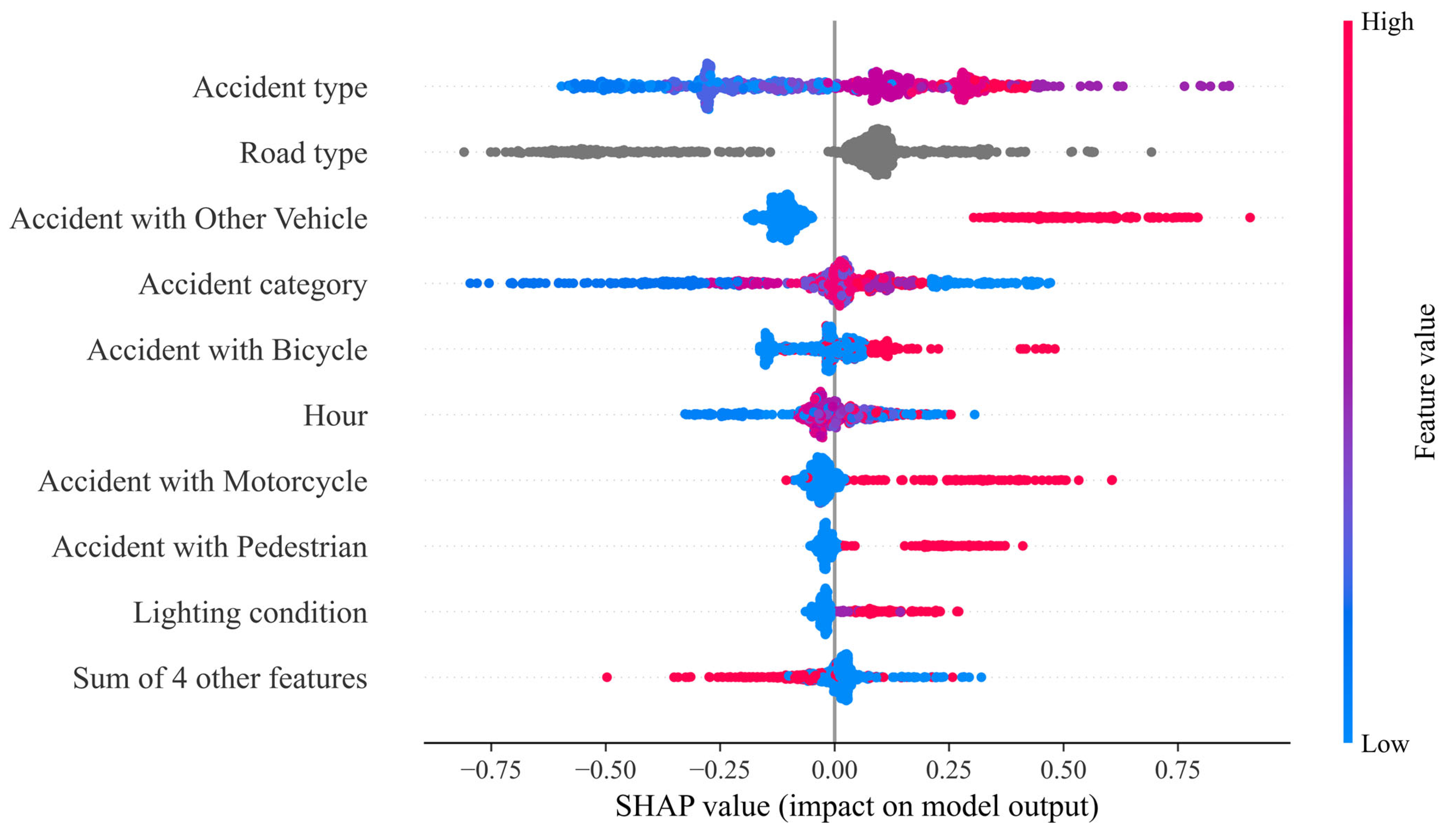 Figure 13 shows that we did not merge the categorical features. Summing up the SHAP values of the individual feature classes generalizes the analysis, so we have not performed this step yet. Some feature classes increase the prediction probability, while others reduce it. Additionally, the feature classes have nominal scales, meaning they have no natural order. A higher crash type class does not necessarily have a higher or lower influence on the prediction. Summarizing the SHAP values of features with multiple classes means that their influences can no longer be interpreted using a Beeswarm plot (see