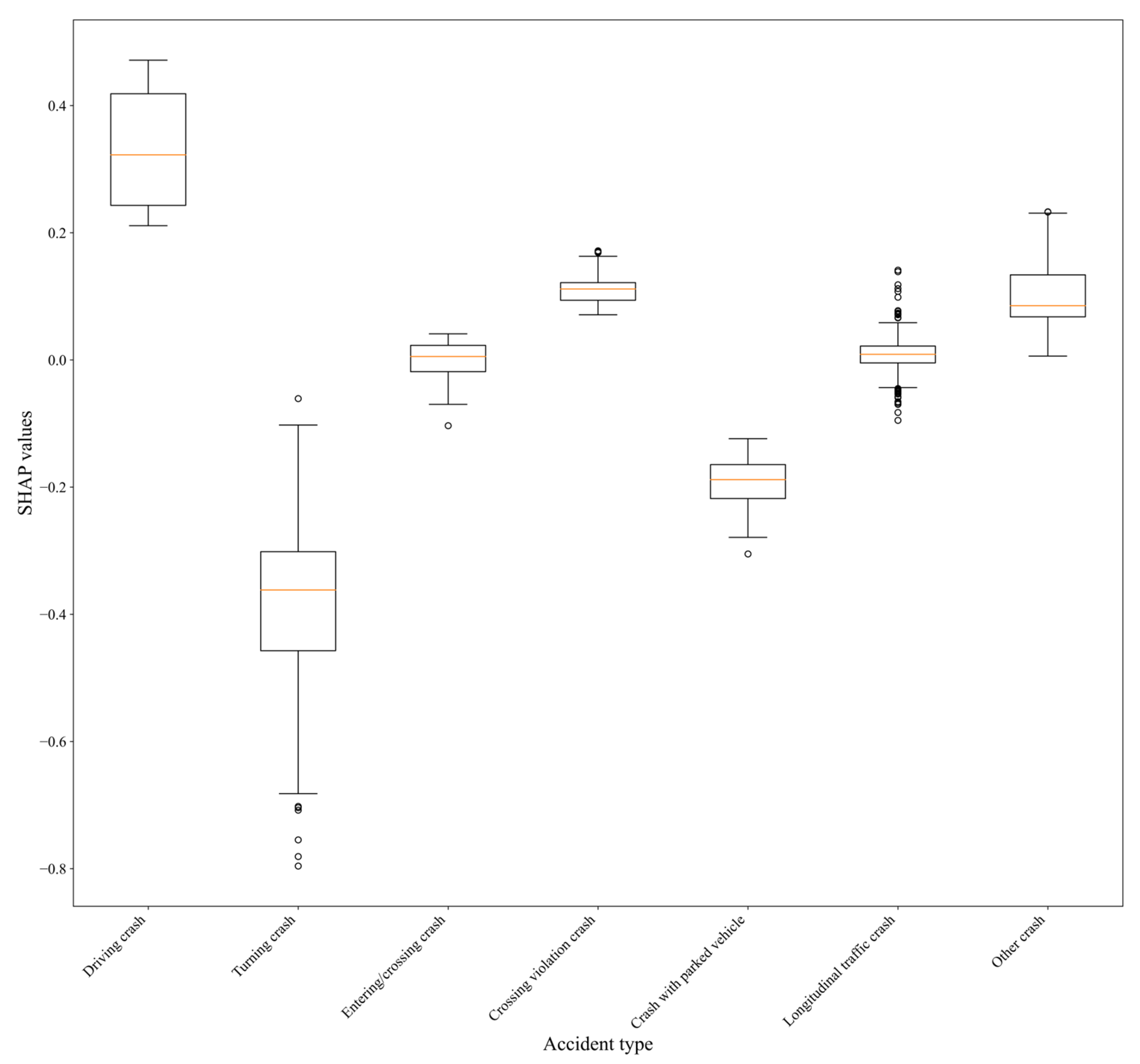 Figure 15). For example, we use the boxplot to show the individual crash type categories and their average influence on the probability of a crash being classified as fatal. This representation allows one to compare the influencing factors of the classes of an individual feature. However, it is important to note that all instances are considered—including those, the model does not predict as fatal crashes. We based our approach on handling and visualizing categorical features on the work of [