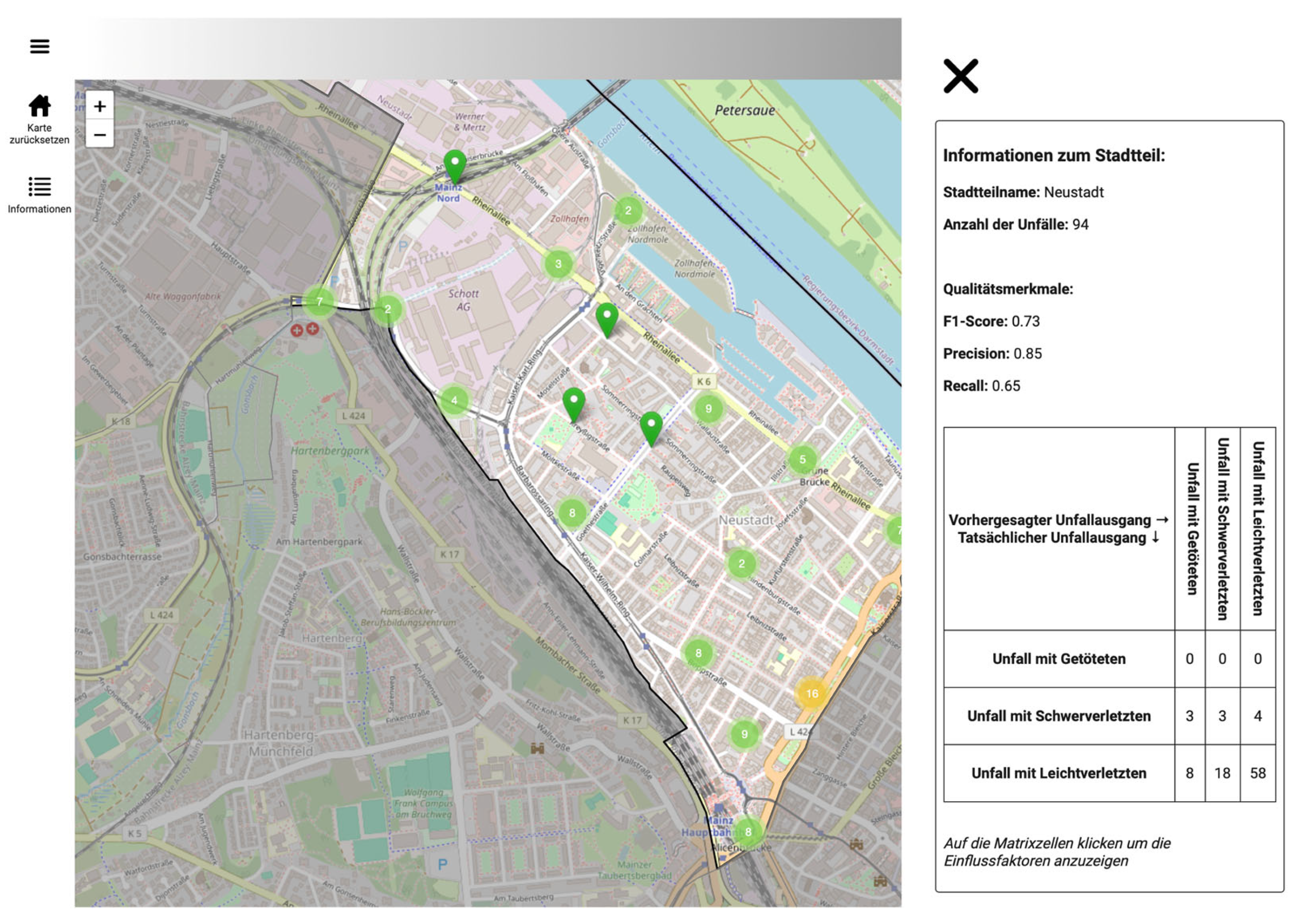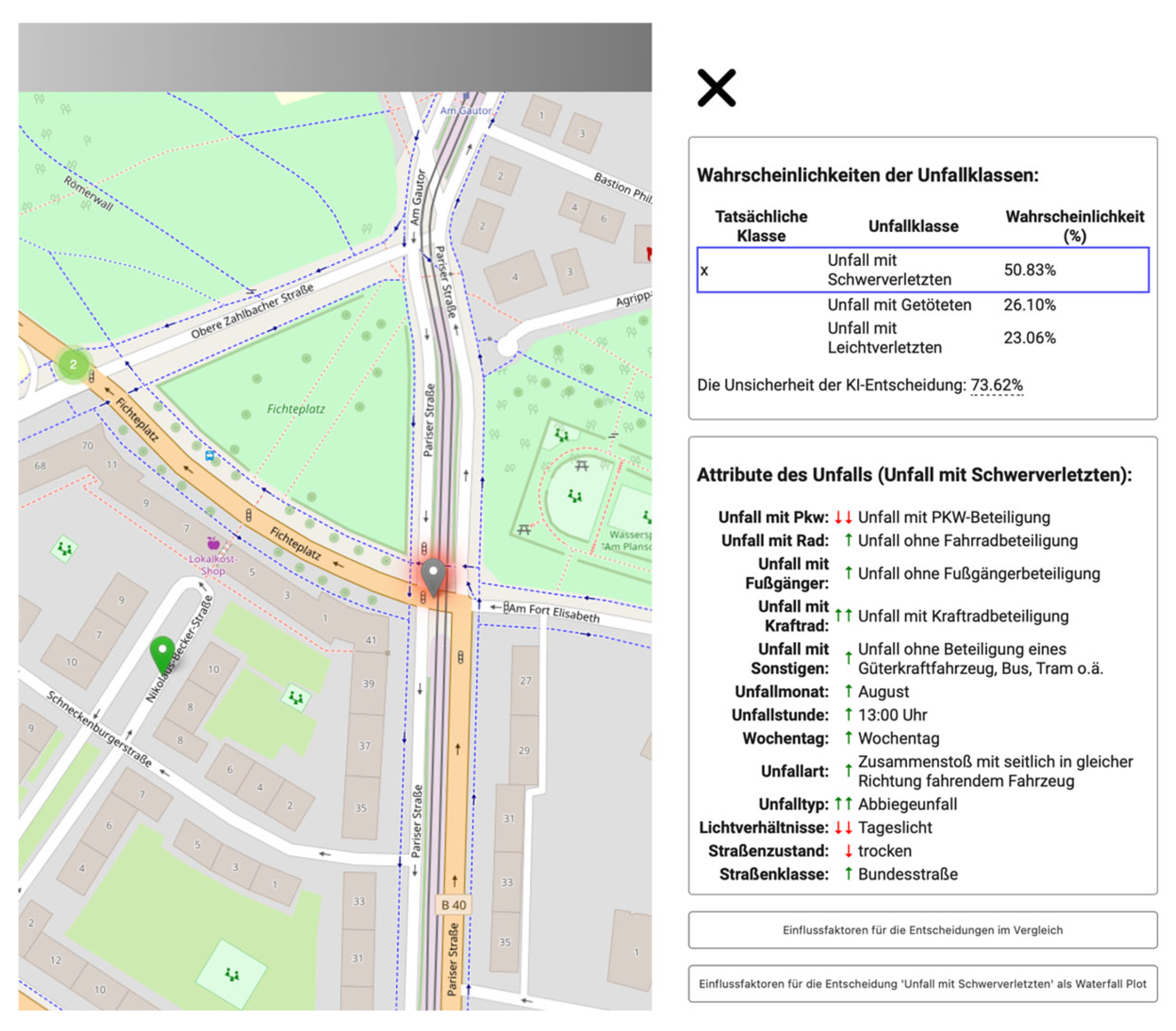 The developed concept enables targeted analysis of crash patterns at the district level, reduces the amount of displayed data, and combines interactive visualizations with differentiated model evaluation. Separating correctly and incorrectly classified crashes and using common slide types supports transparent and low-threshold interpretation of the influencing factors.