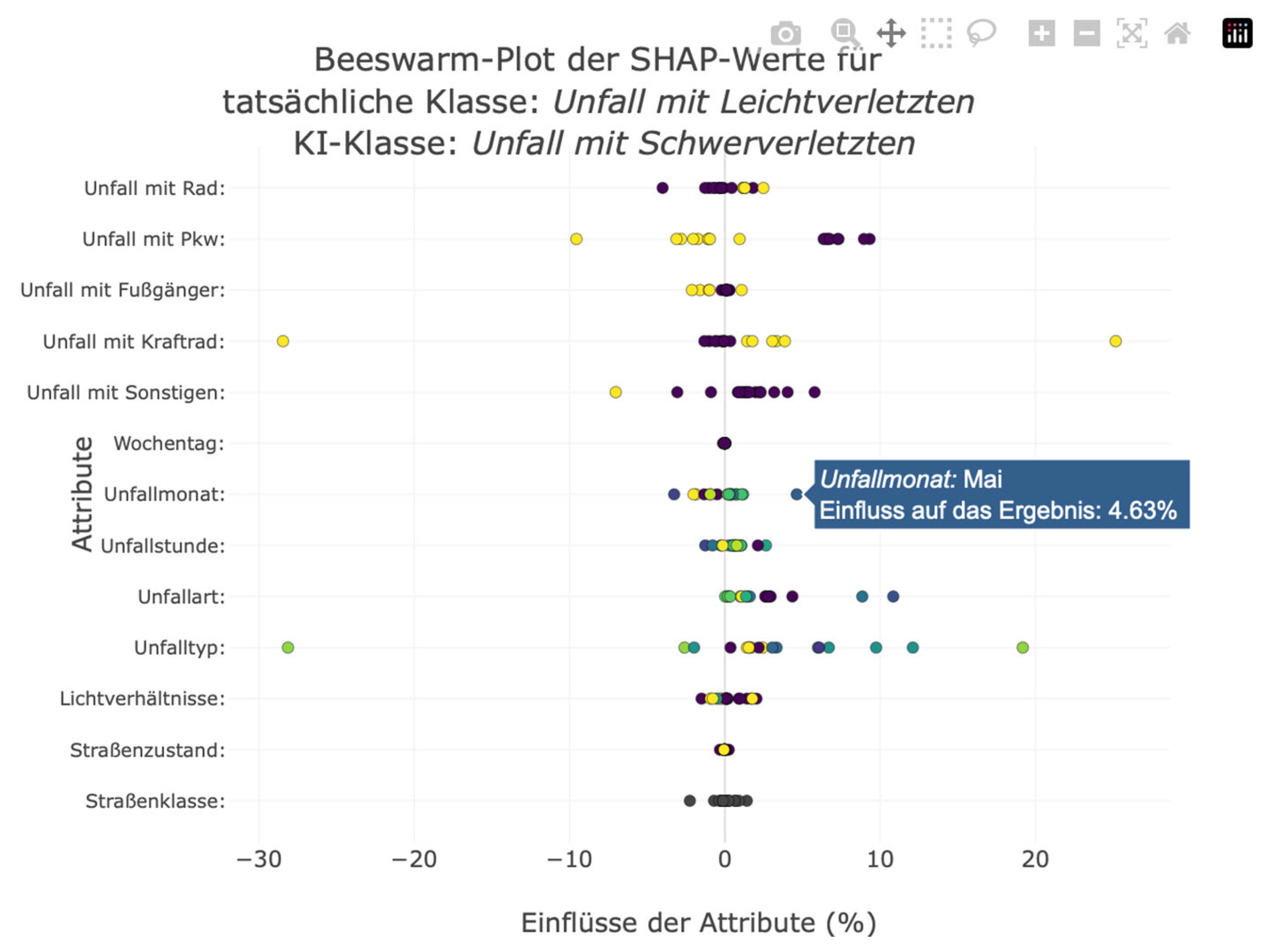 Figure 23). Here, experts can view all values simultaneously. However, potential users often lack prior knowledge of ML classifications and therefore cannot interpret the specified class probabilities and SHAP values. In extreme cases, this could lead the user to interpret the specified influencing factors as the importance of a feature for crash severity in the real world. The dashboard does not clearly communicate that the calculated influencing factors affect only the ML prediction and not the actual causes of the crash.