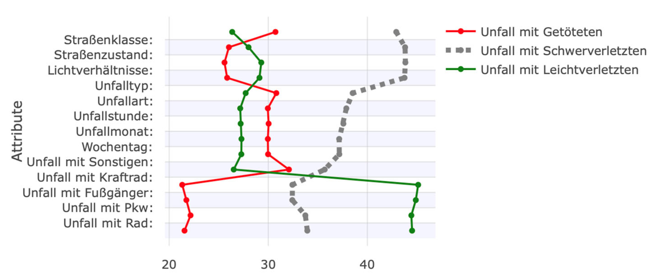 13]. They used 53,732 crashes from Florida in 2006, each with 17 descriptive features and 4 crash classes. They achieved an accuracy of 54.84% for the test dataset, which is comparable to other studies. In addition, they performed sensitivity tests on the trained ML model to make the decision making more comprehensible. Approaches such as these are the first step in analyzing the factors influencing predicted crash severity. However, this approach can only identify influences globally. The Correlations and effects of individual characteristics are not covered.