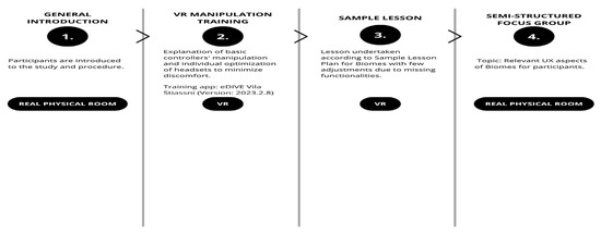 Phase two consisted of semi-structured group interviews to gather comprehensive insights into participant experiences. A scheme of the experiment’s procedure is illustrated in Figure 3. The research employed Interpretative Phenomenological Analysis (IPA) to examine individual experiences and their meanings within the VR environment.