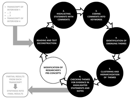 Transcripts were analysed individually through an iterative process of repeated reading, deconstruction, and careful examination. Significant statements were highlighted, and initial notes were keyword-coded to identify emerging themes for each transcript. Following individual analysis, relationships between themes were explored, creating a hierarchical structure that allowed for categorising factors into distinct spheres of influence. The entire analytic process is illustrated in Figure 4. This systematic approach enabled a nuanced understanding of the participants’ experiences, ensuring that collective patterns and unique individual insights were thoroughly examined and integrated into the research findings. For this article, the verbatim excerpts from the participants were translated from the Czech language, with the filler words subsequently removed.