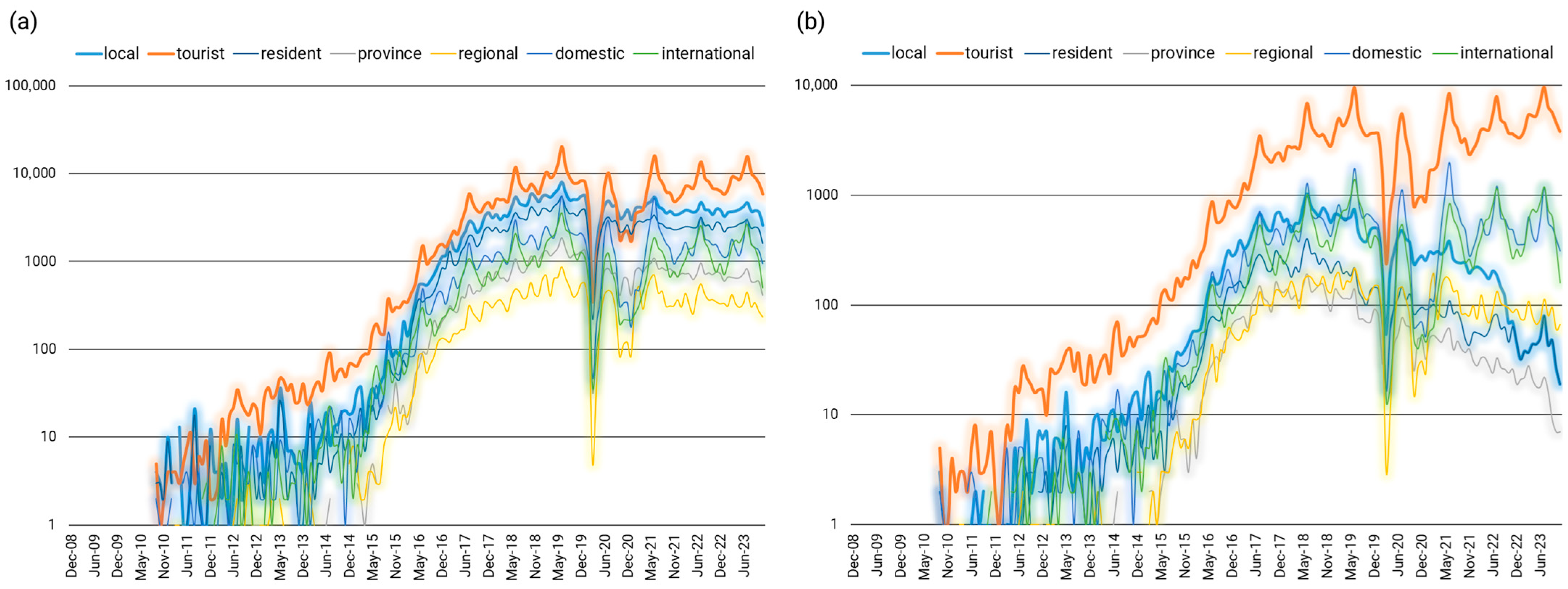 Text mining, image analysis, and automatic classification models have also been combined to differentiate residents from tourists based on behavioral patterns [14,28]. Neural networks and semantic algorithms have been used to classify tourists according to their spatiotemporal trajectories [29], and advanced visualization tools have been developed to represent urban behaviors at multiple scales [30].