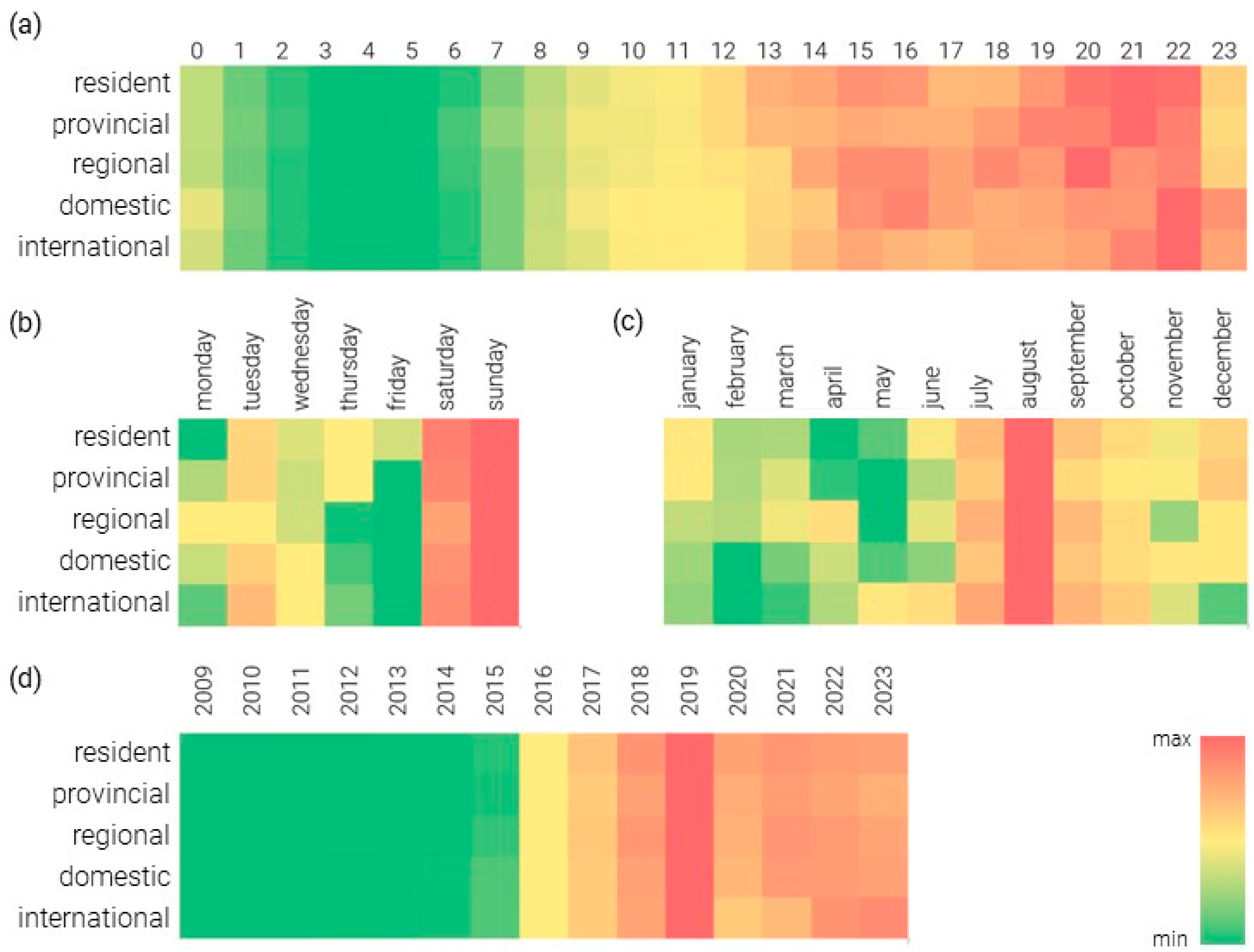 The proposed methodology enhances both the accuracy and scope of previous research. Tourist and visitor profiles are segmented based on the location history of their reviews, surpassing conventional approaches that rely on standardized length of stay. The data source enables hourly-level analysis, offering a finer temporal resolution than earlier studies based on weekly or monthly windows. Moreover, its extensive time span allows for the examination of long-term trends and the impact of specific events, such as COVID-19.