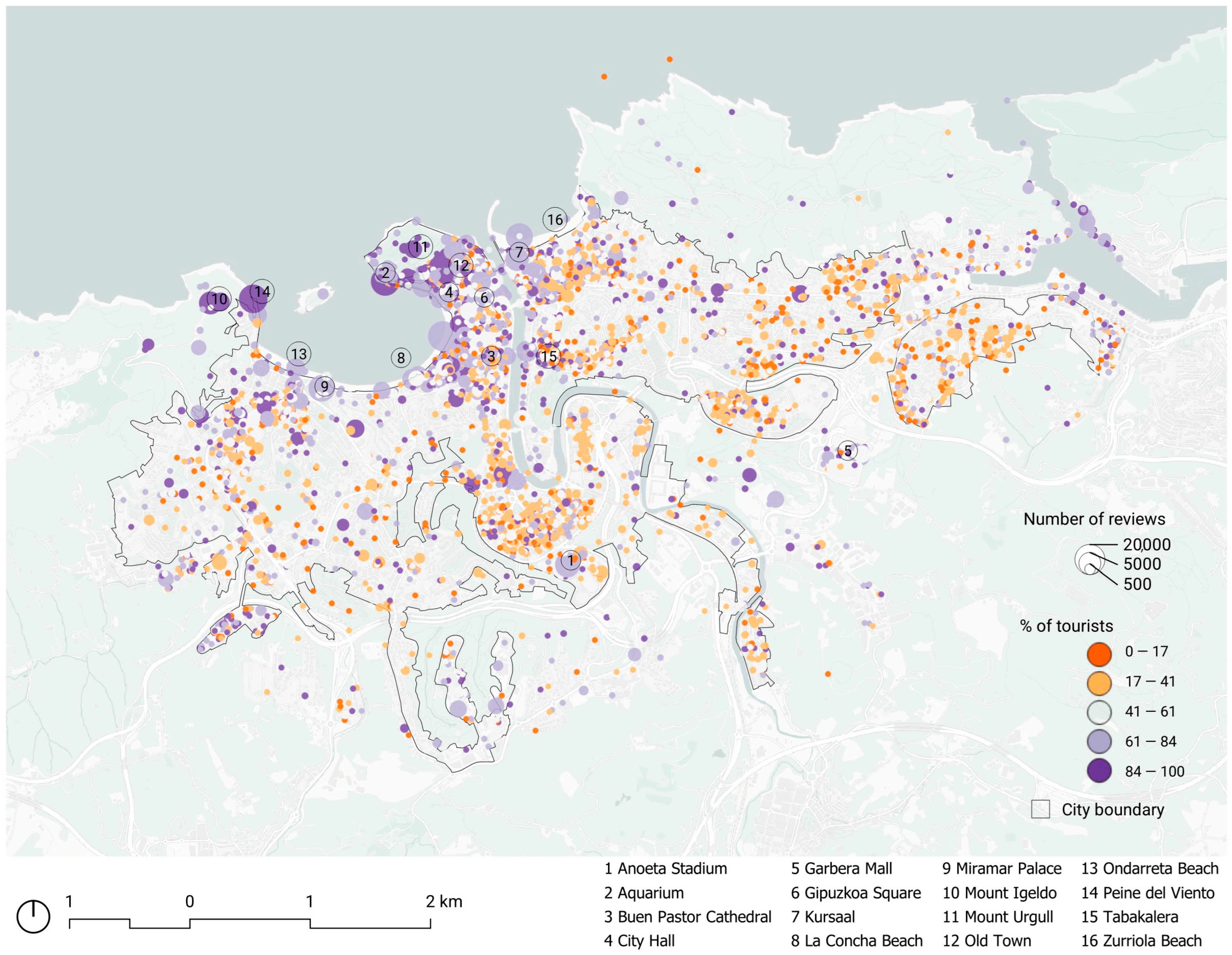 Moreover, the seasonality of tourism, its coastal geography, and the compact urban structure of Donostia-San Sebastián allow for a clear observation of differences in public space usage between residents and visitors, as well as potential transformations linked to tourism. This particular configuration makes the city a representative laboratory for exploring the boundaries and evolution of urban areas through UGC and methodologies that can be replicated in other urban settings with similar characteristics.